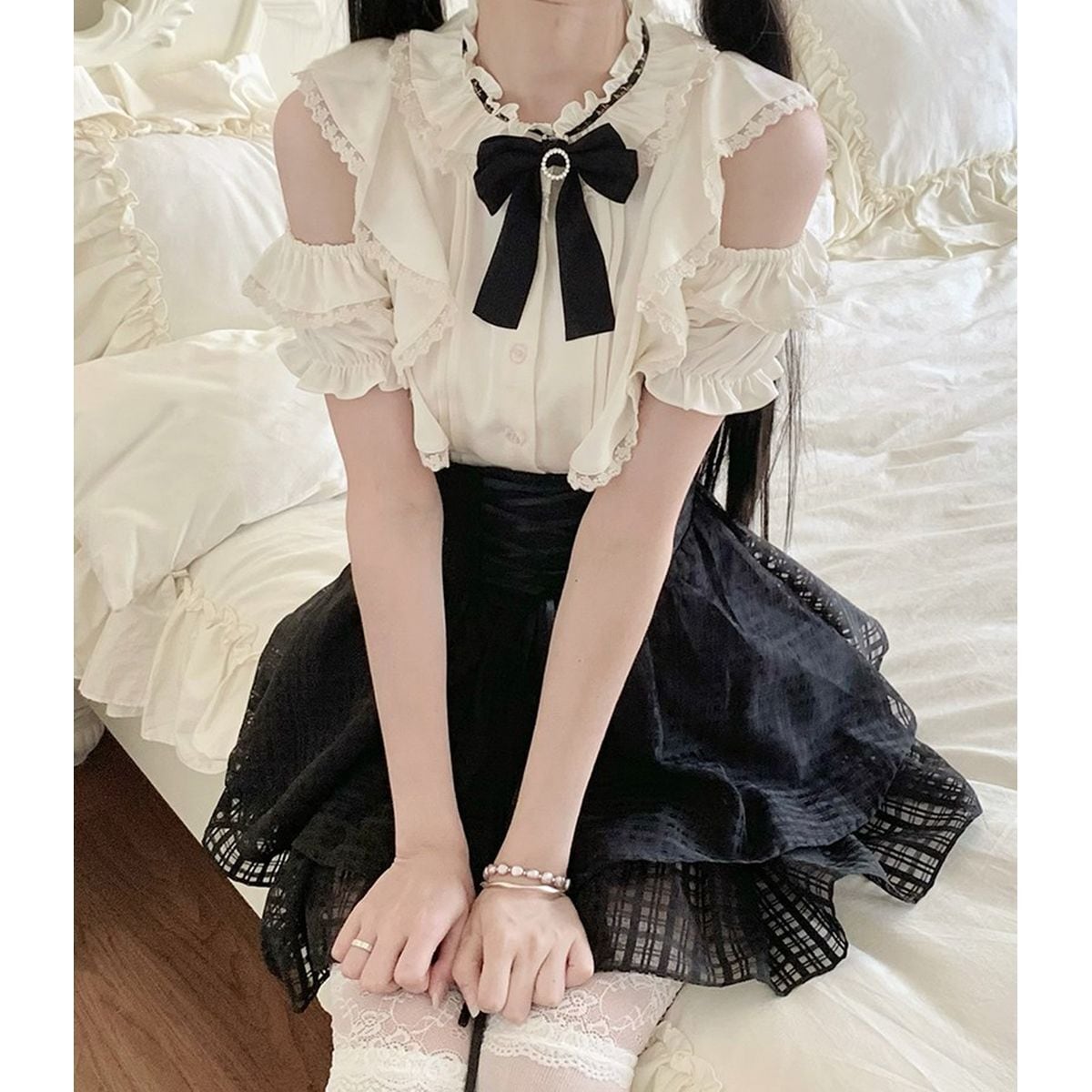 地雷系オープンショルダーレースアップセット:ブラウス