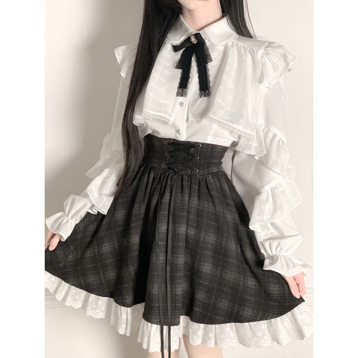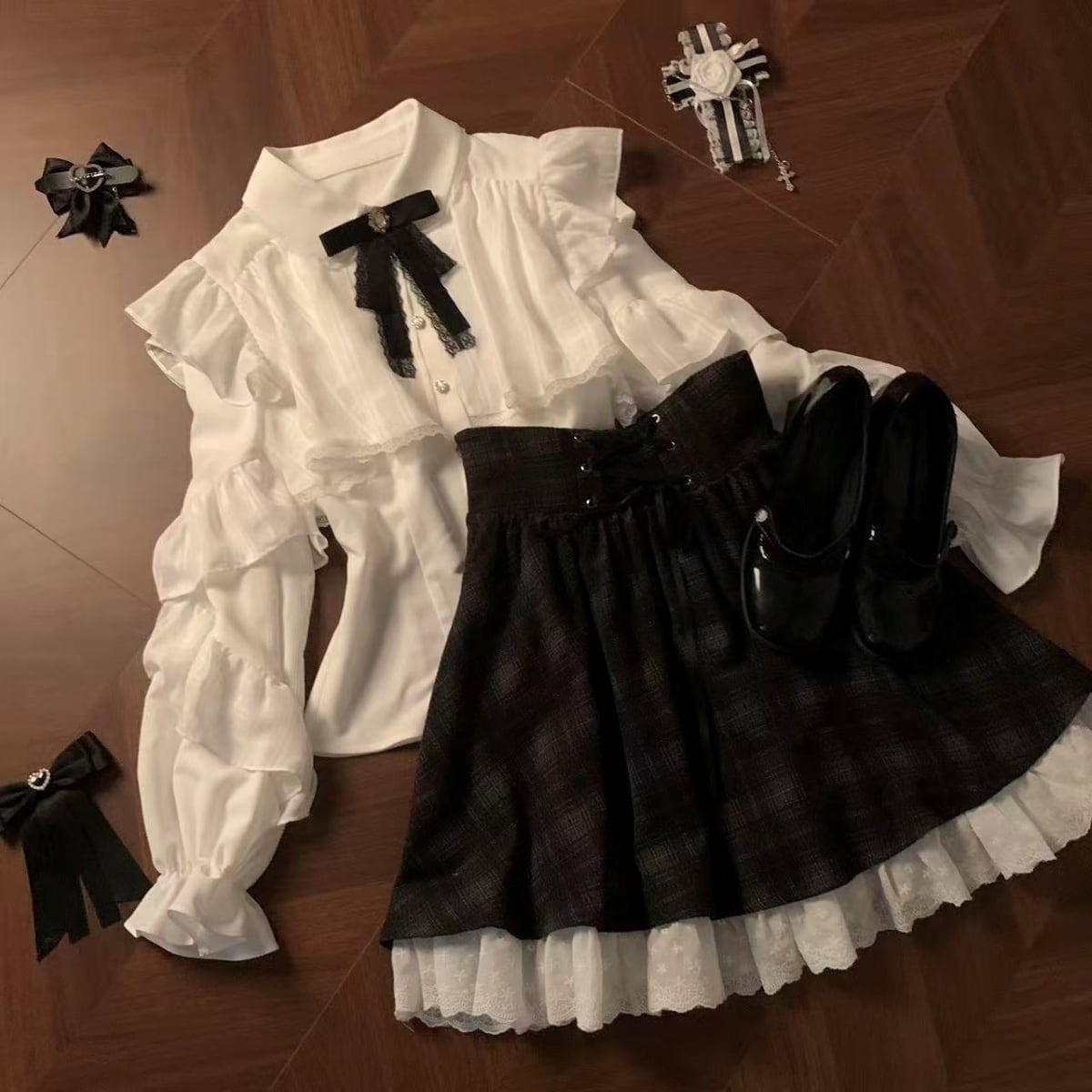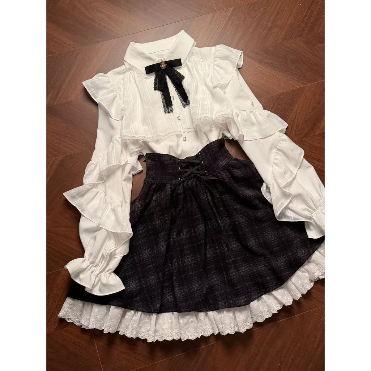 エレガントフリルホワイトブラウス+ブラックチェックスカートセットアップ