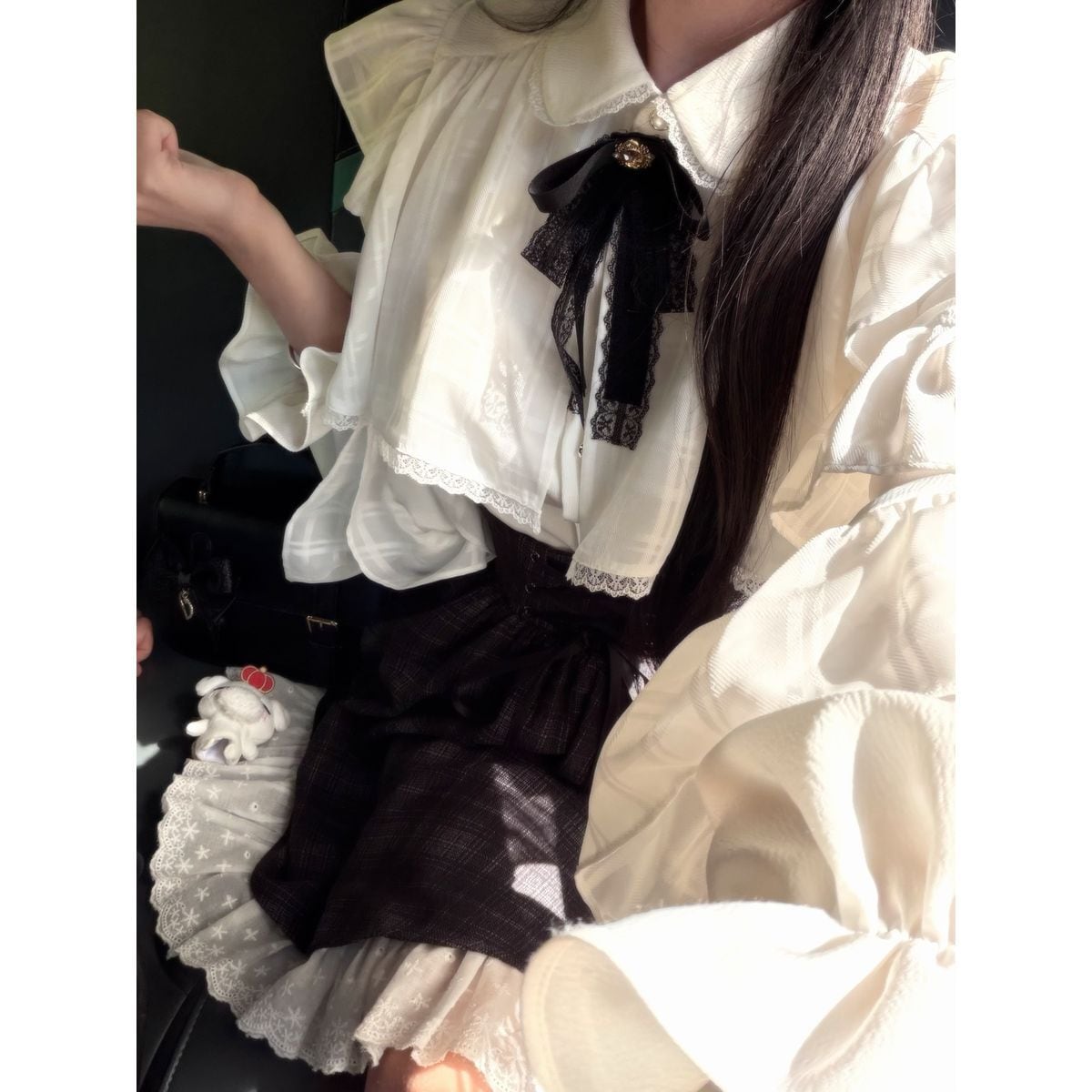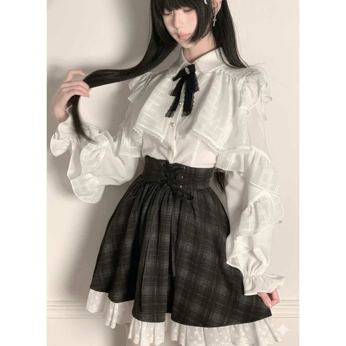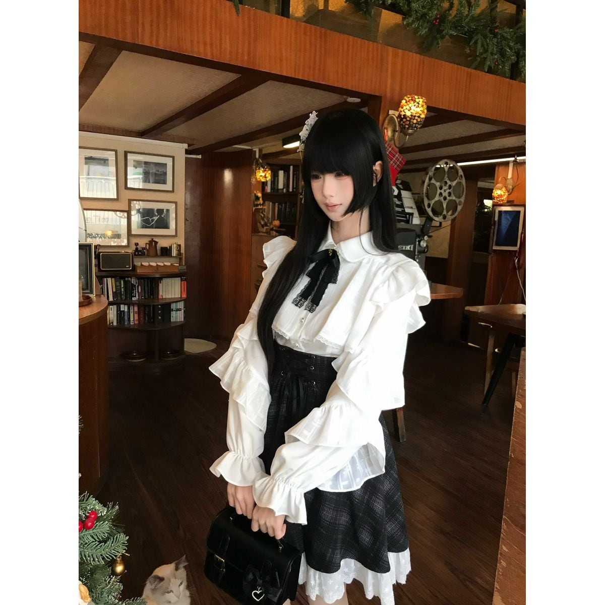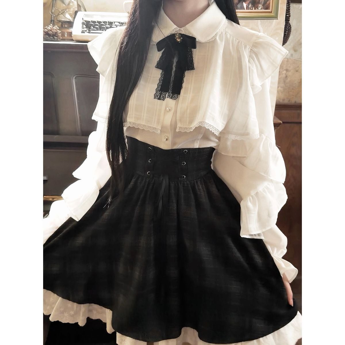 エレガントフリルホワイトブラウス+ブラックチェックスカートセットアップ