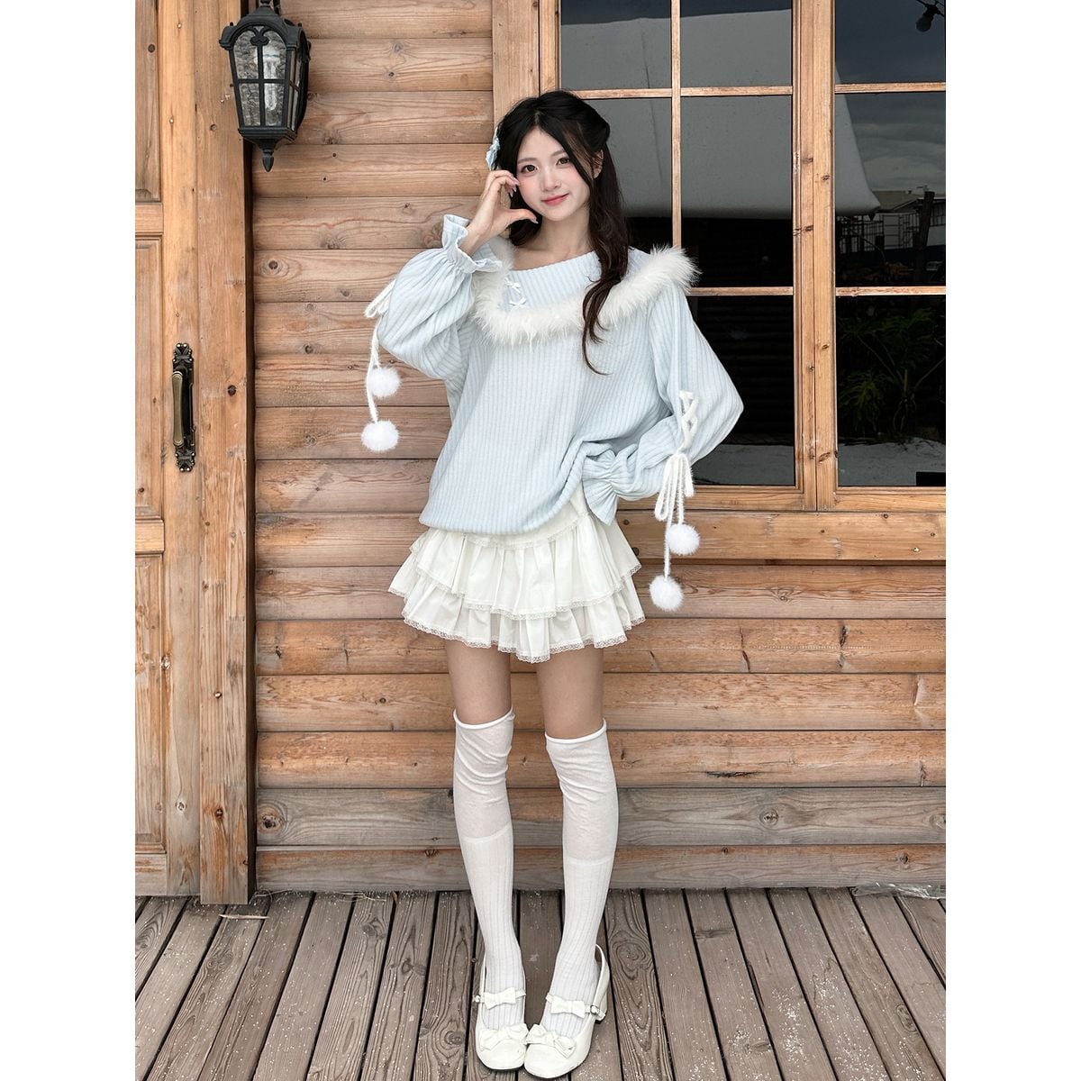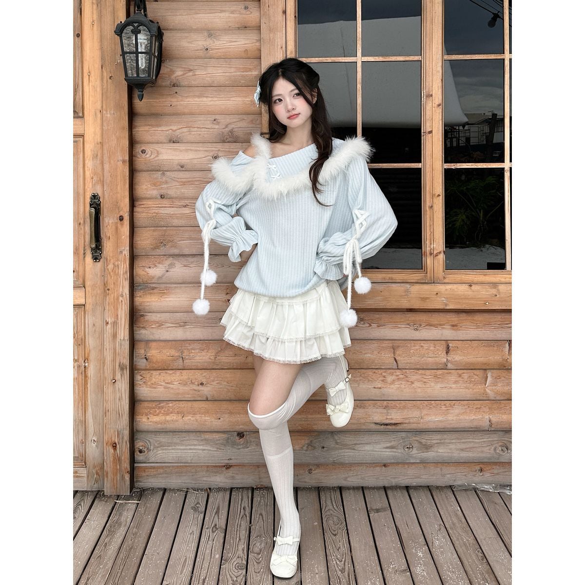 ガーリーオープンショルダーセーター+ティアードスカートセット:トップス