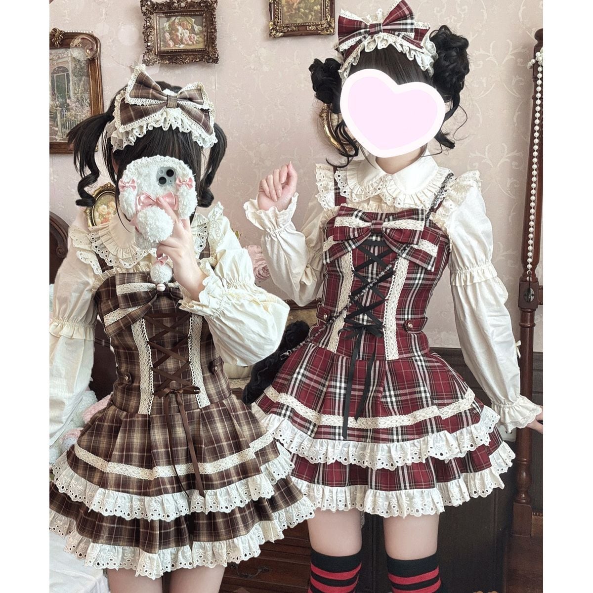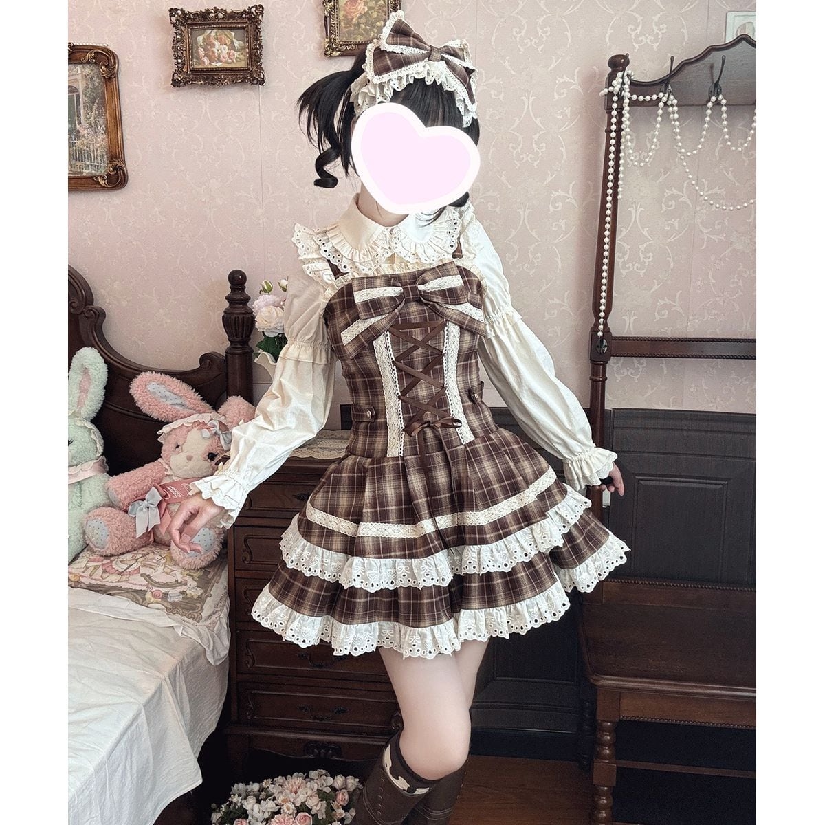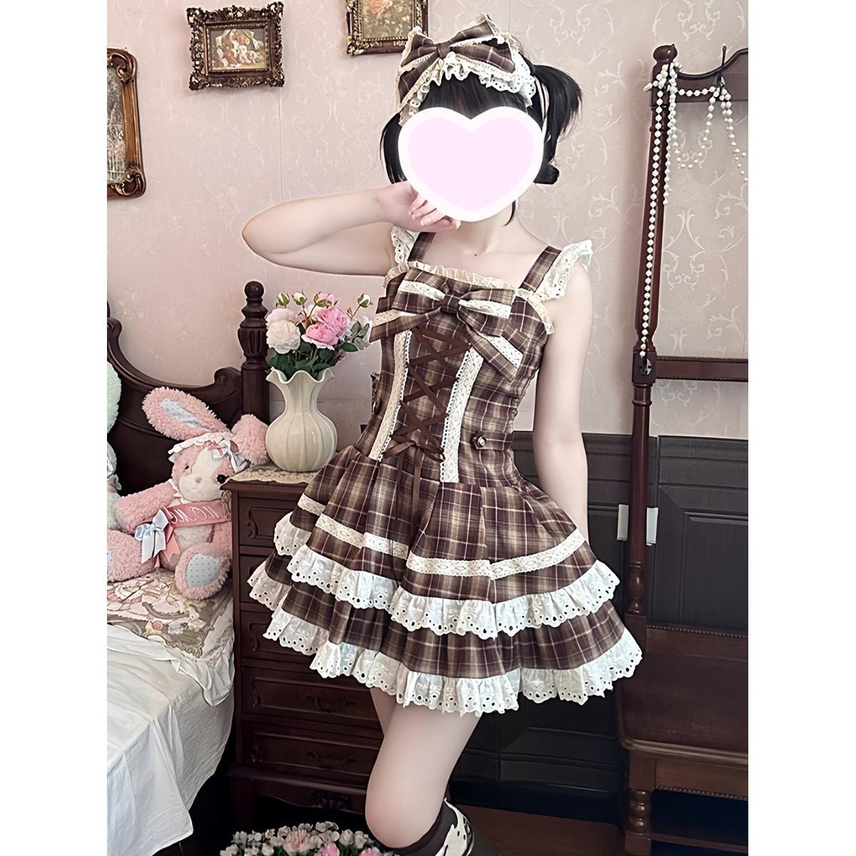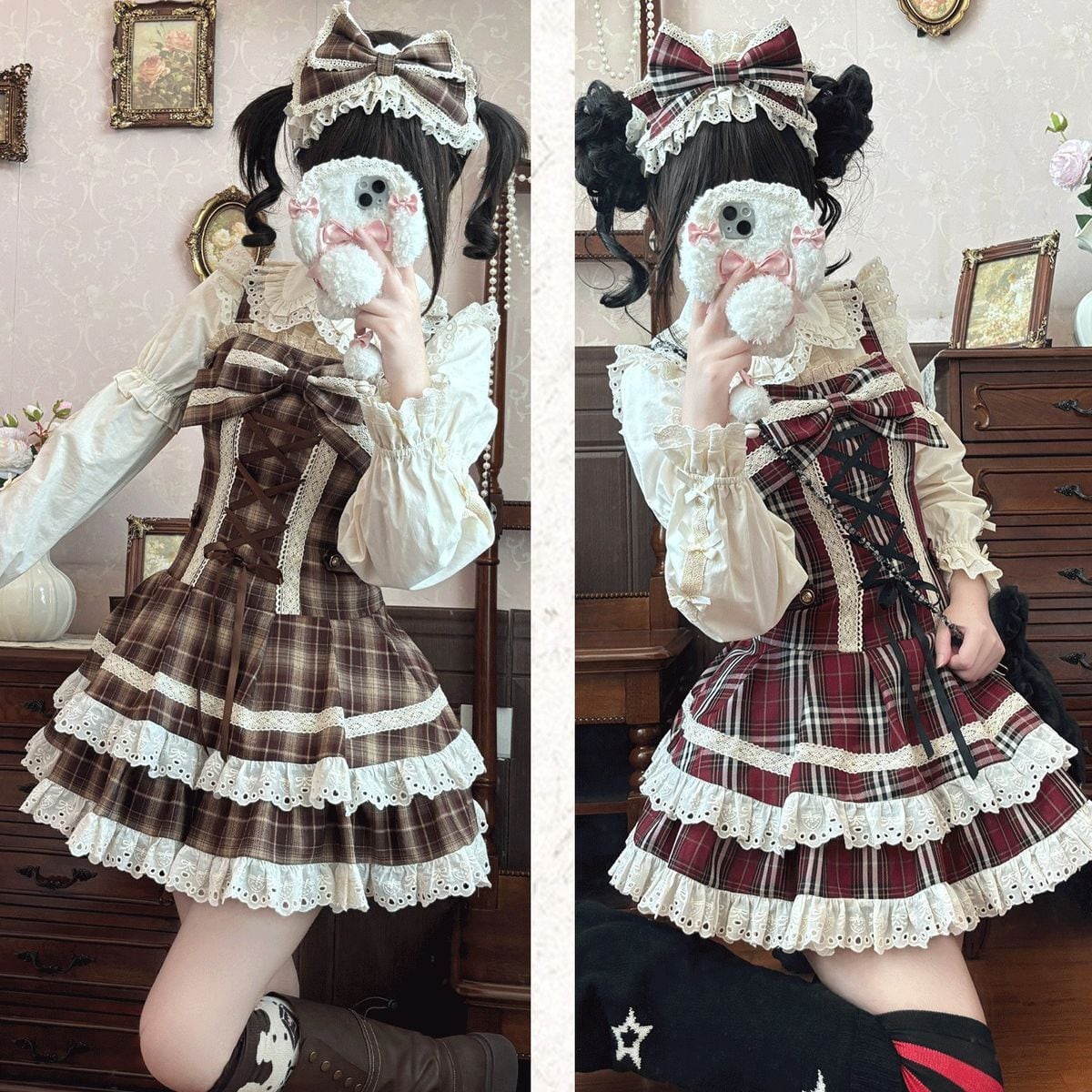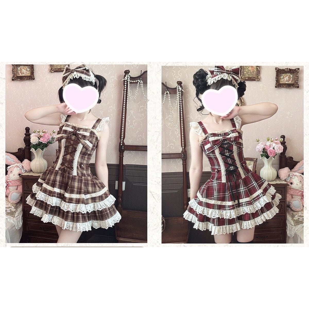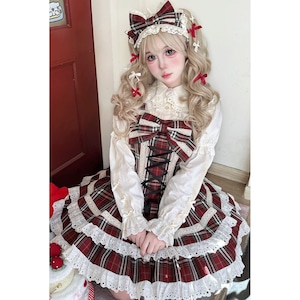 チェック柄レースアップティアードスカートセット:ジャンパースカート