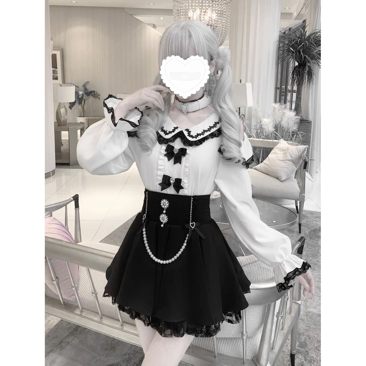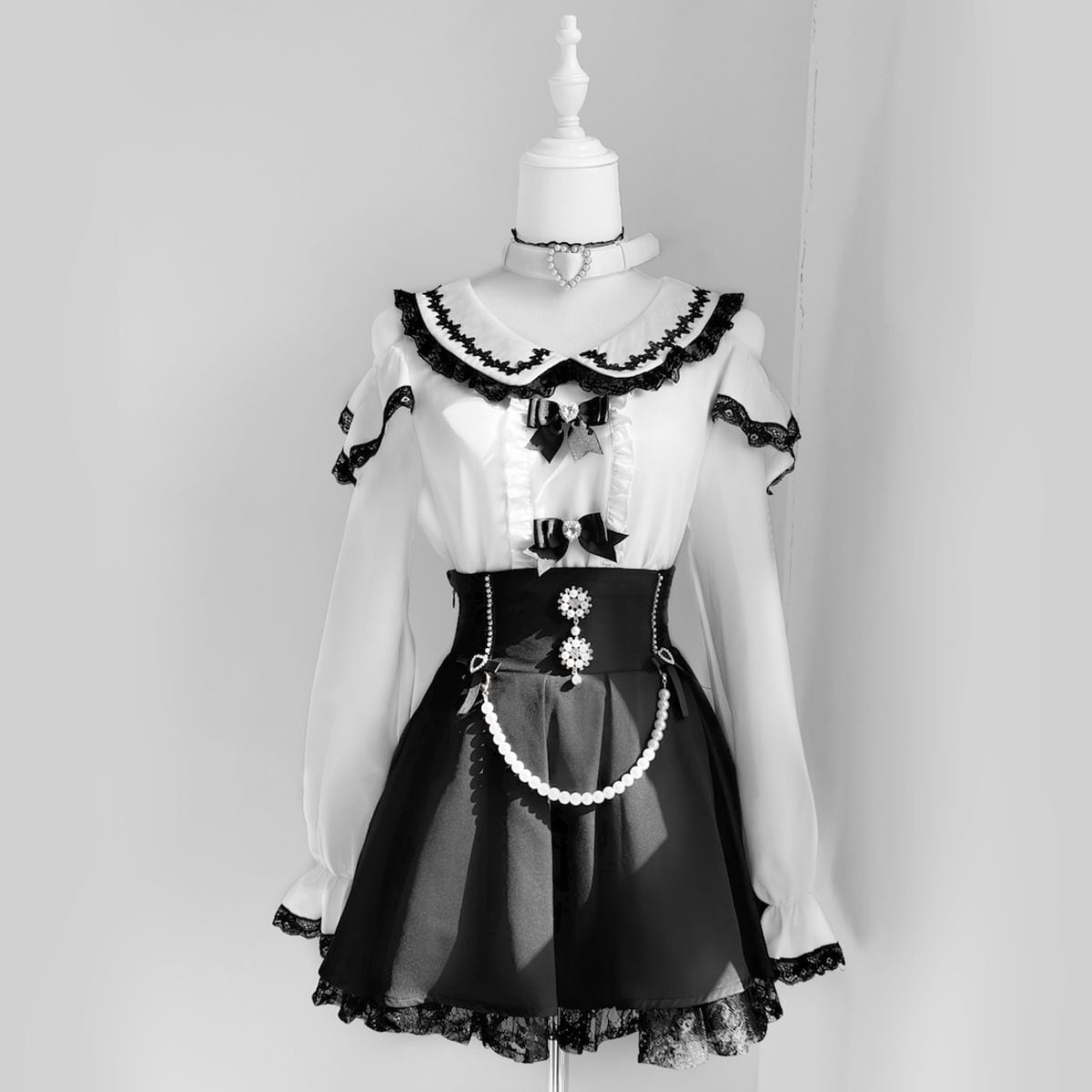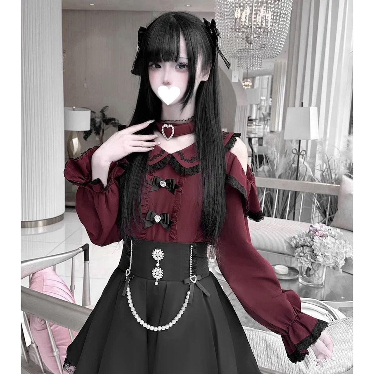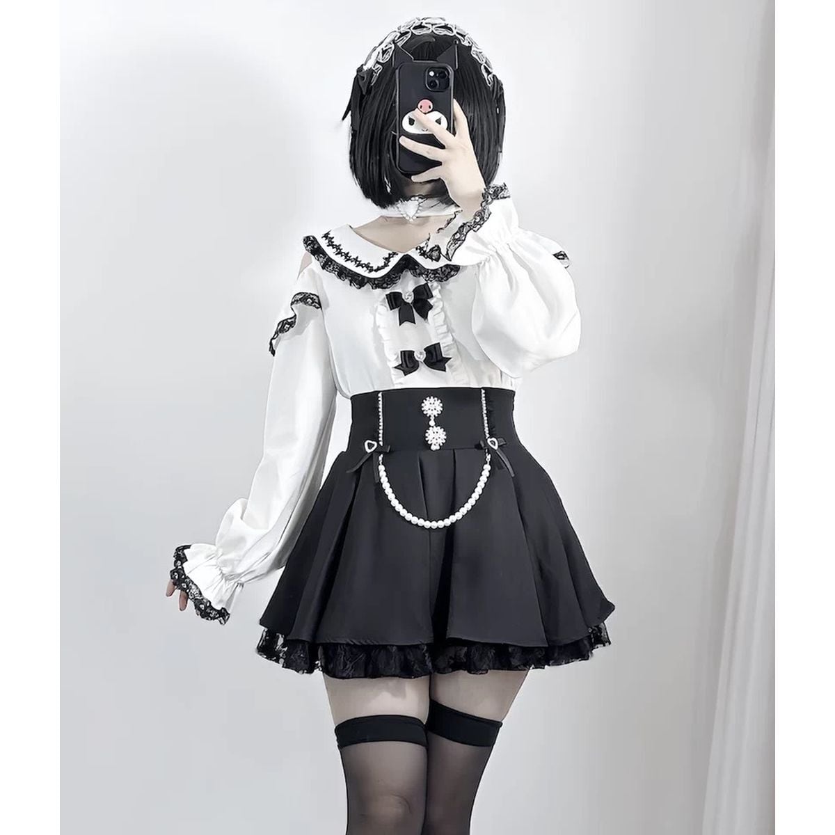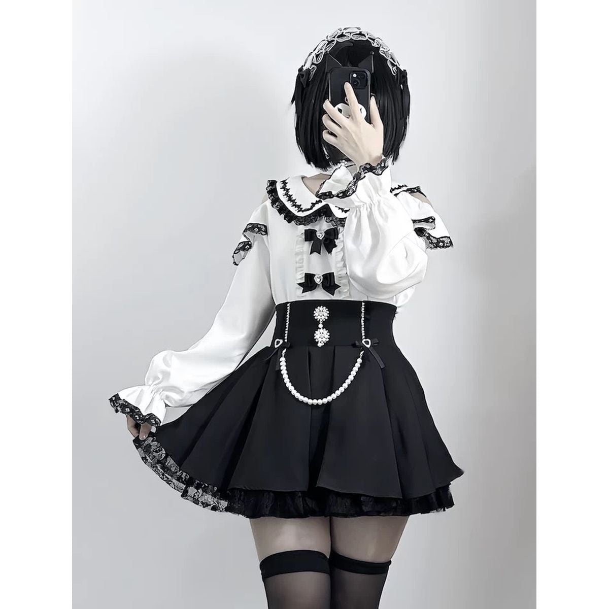 地雷系オープンショルダーパールチェーンスカートセットアップ:長袖ブラウス