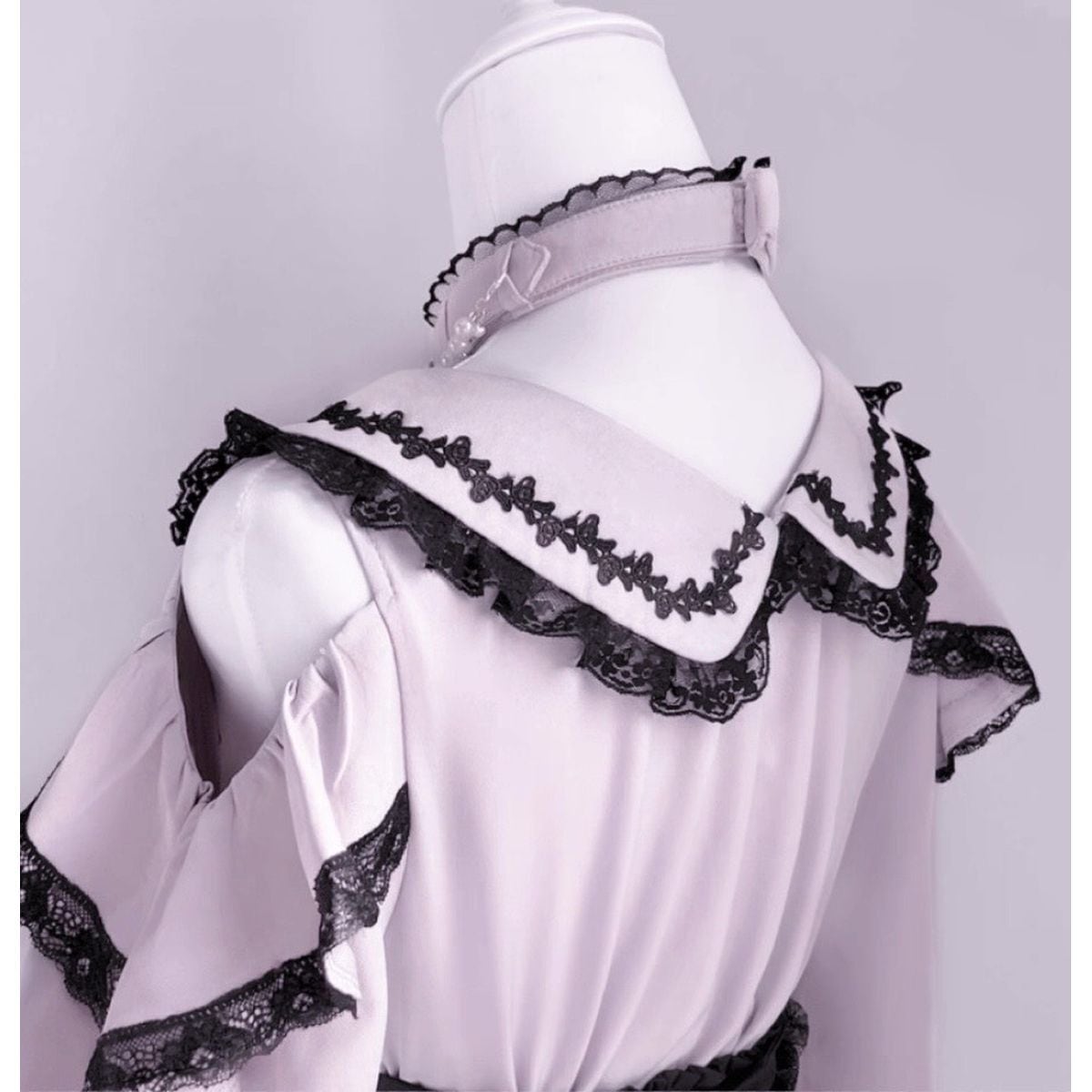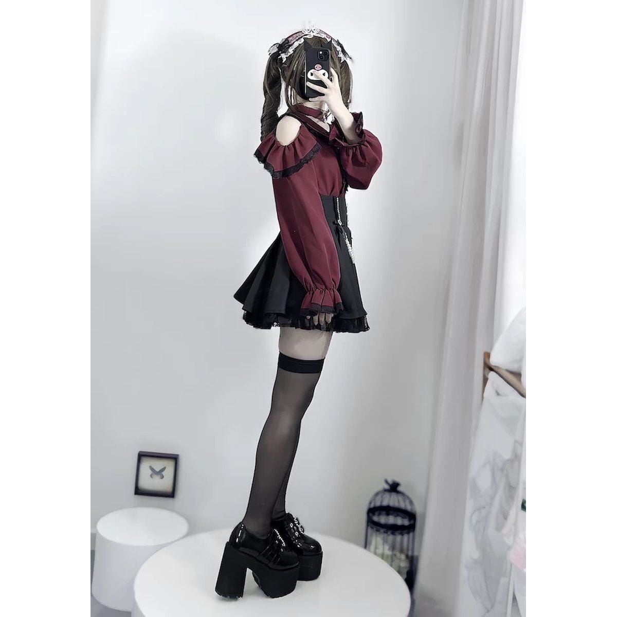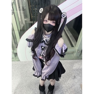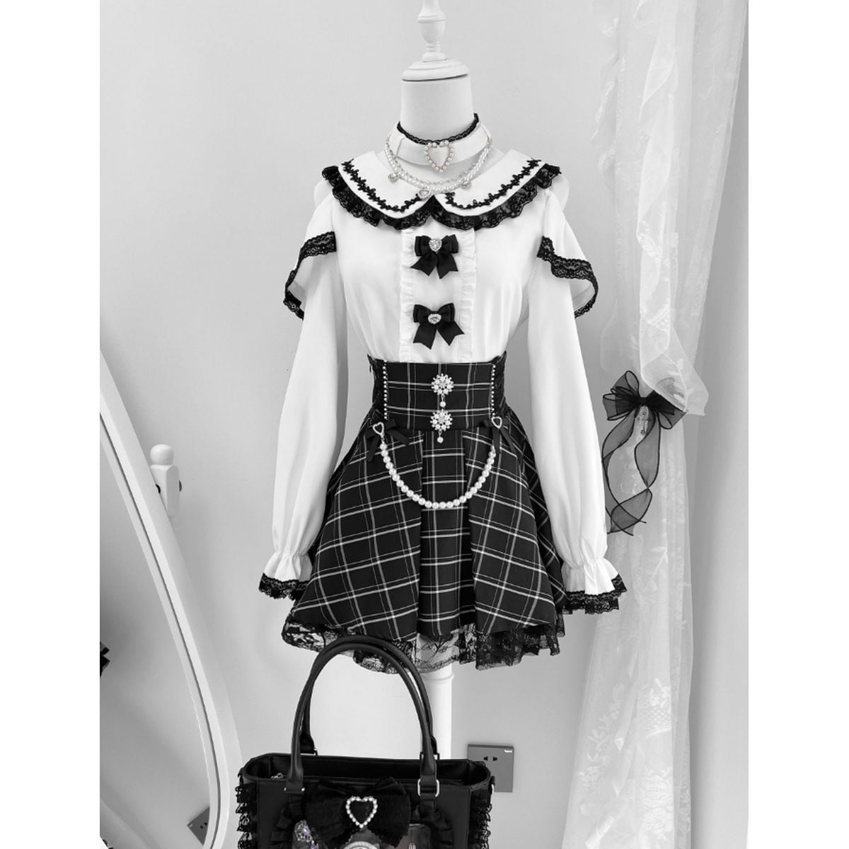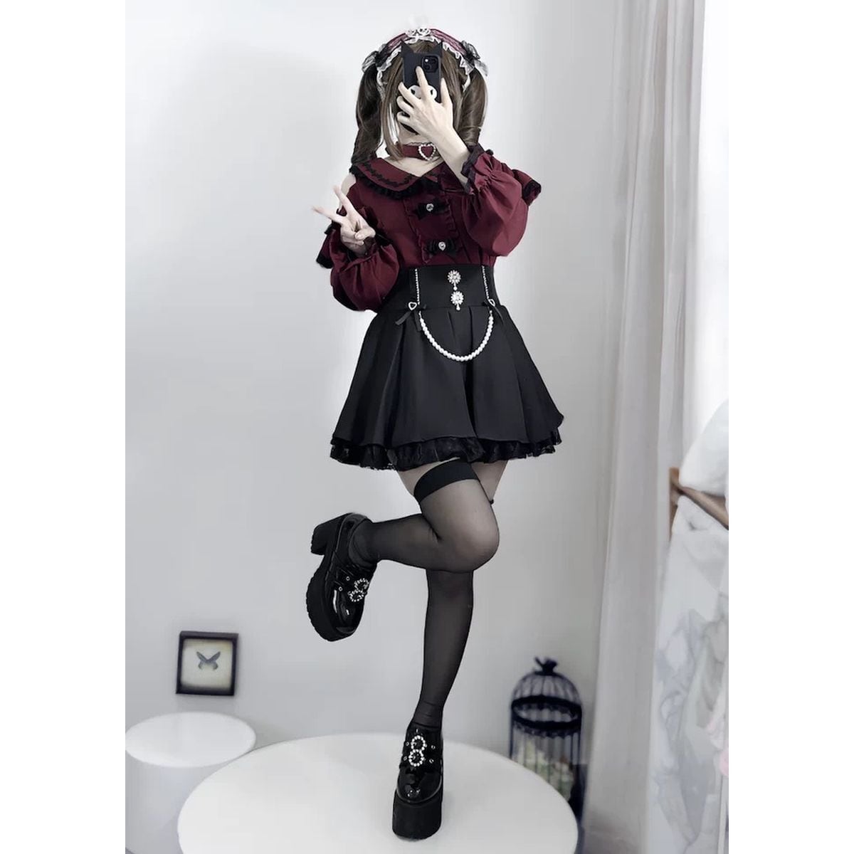 地雷系オープンショルダーパールチェーンスカートセットアップ:長袖ブラウス