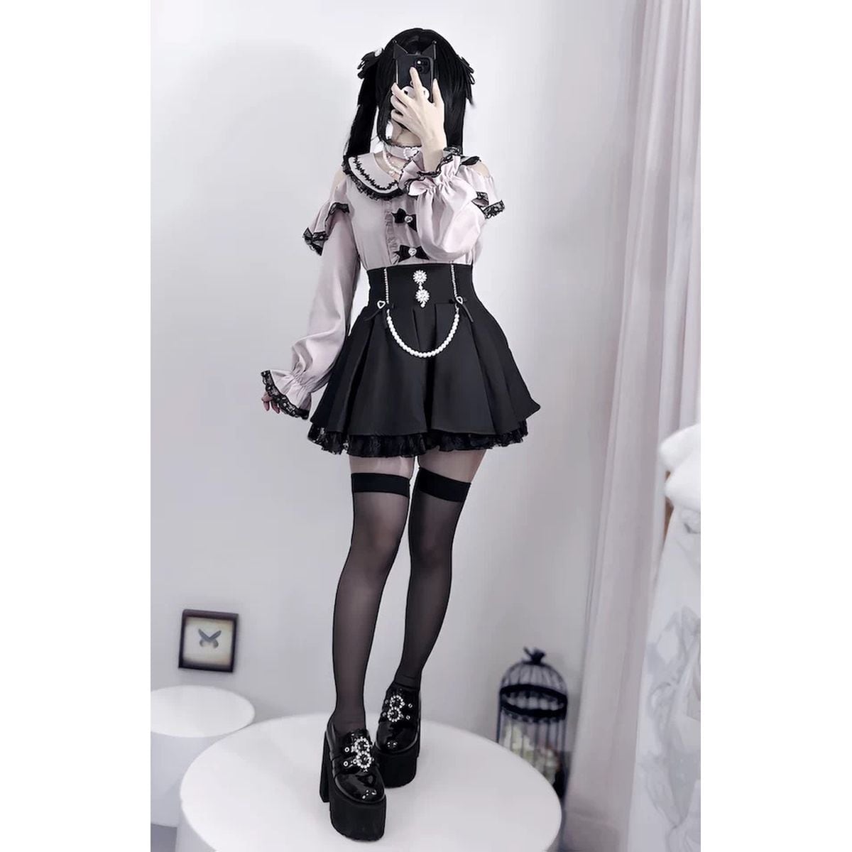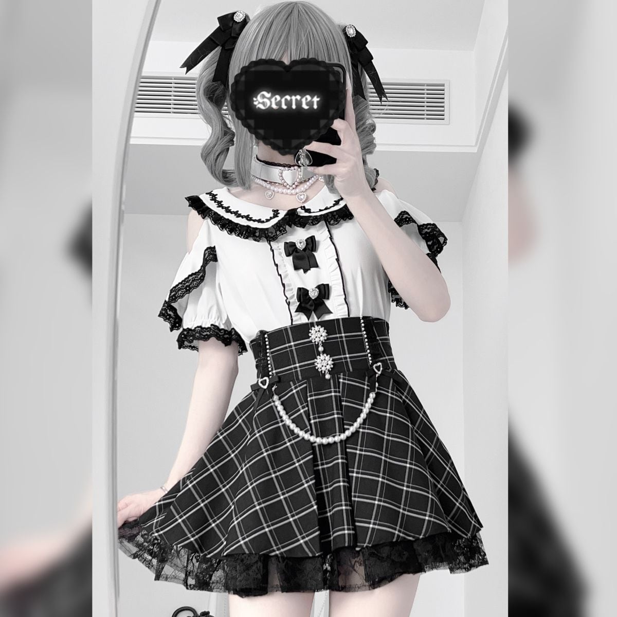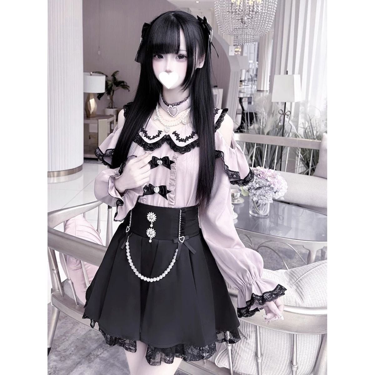 地雷系オープンショルダーパールチェーンスカートセットアップ:半袖ブラウス