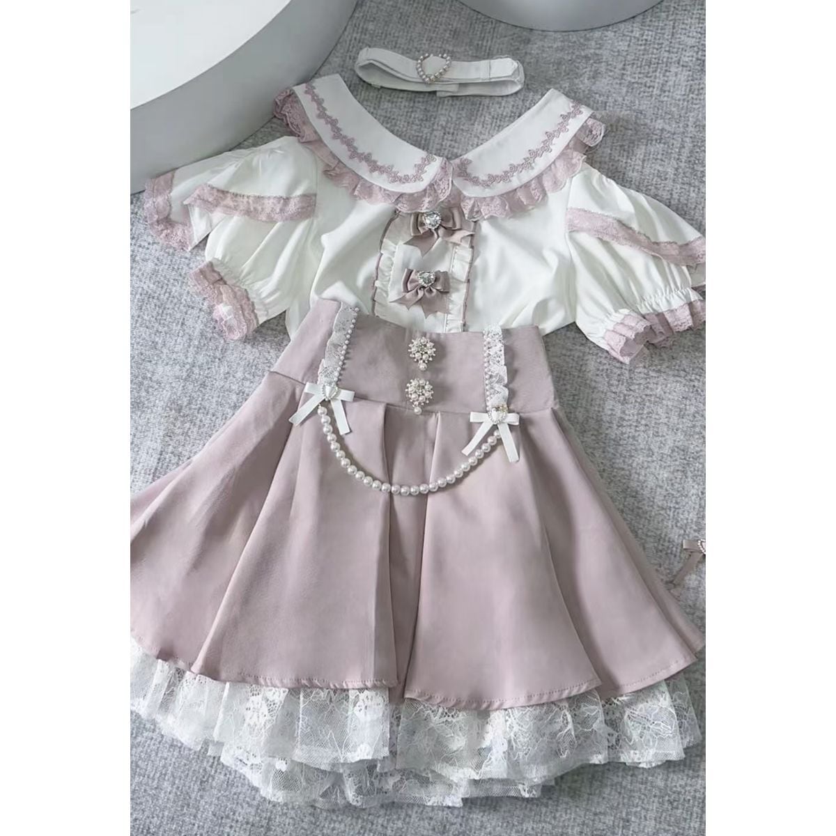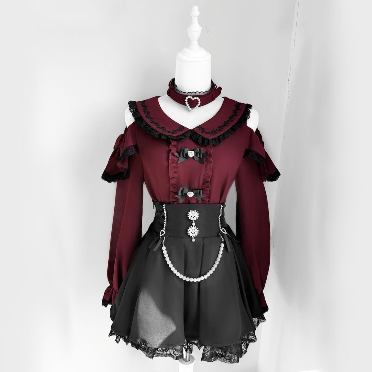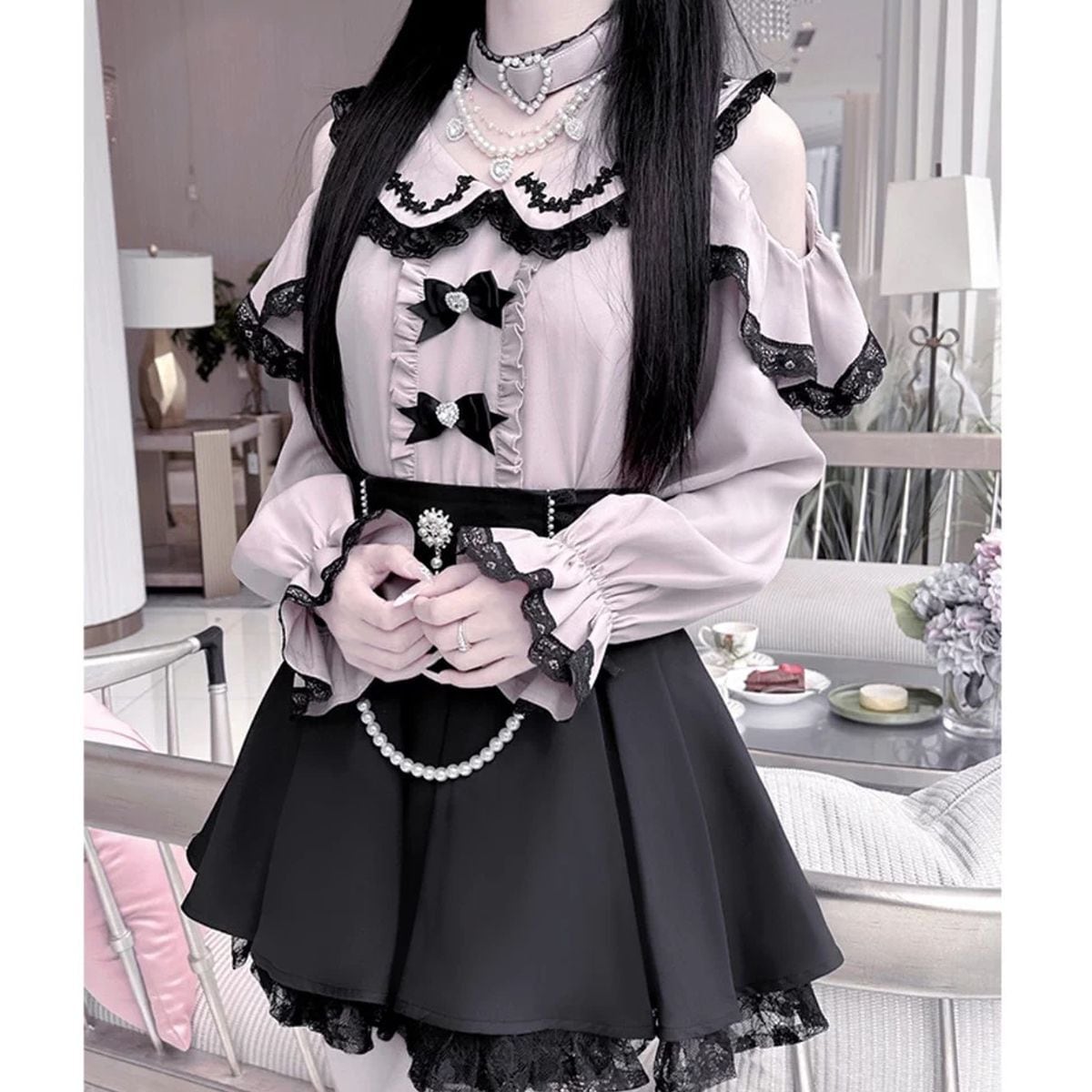 地雷系オープンショルダーパールチェーンスカートセットアップ:半袖ブラウス