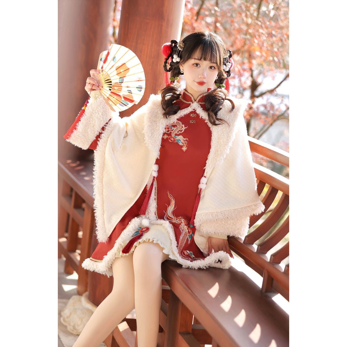 チャイナ風レッドファトリムドレスセットアップ:コート