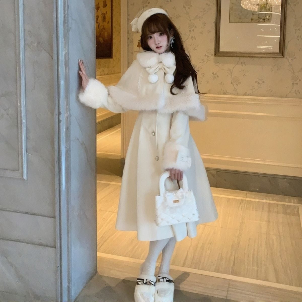 雪の令嬢ファーケープ付きの純白ウィンター2WAYコート