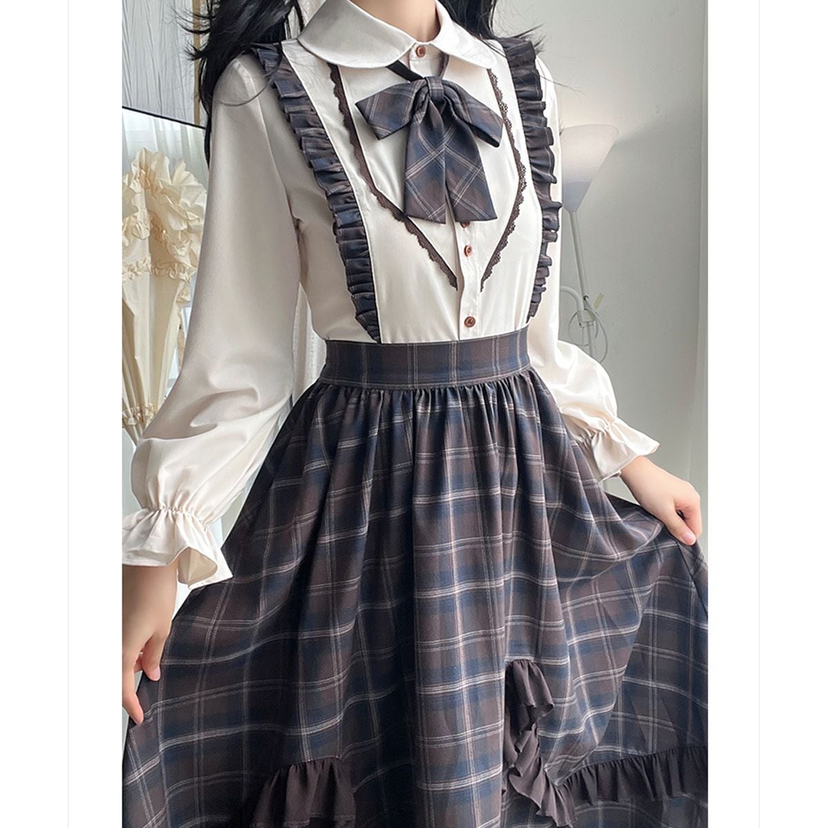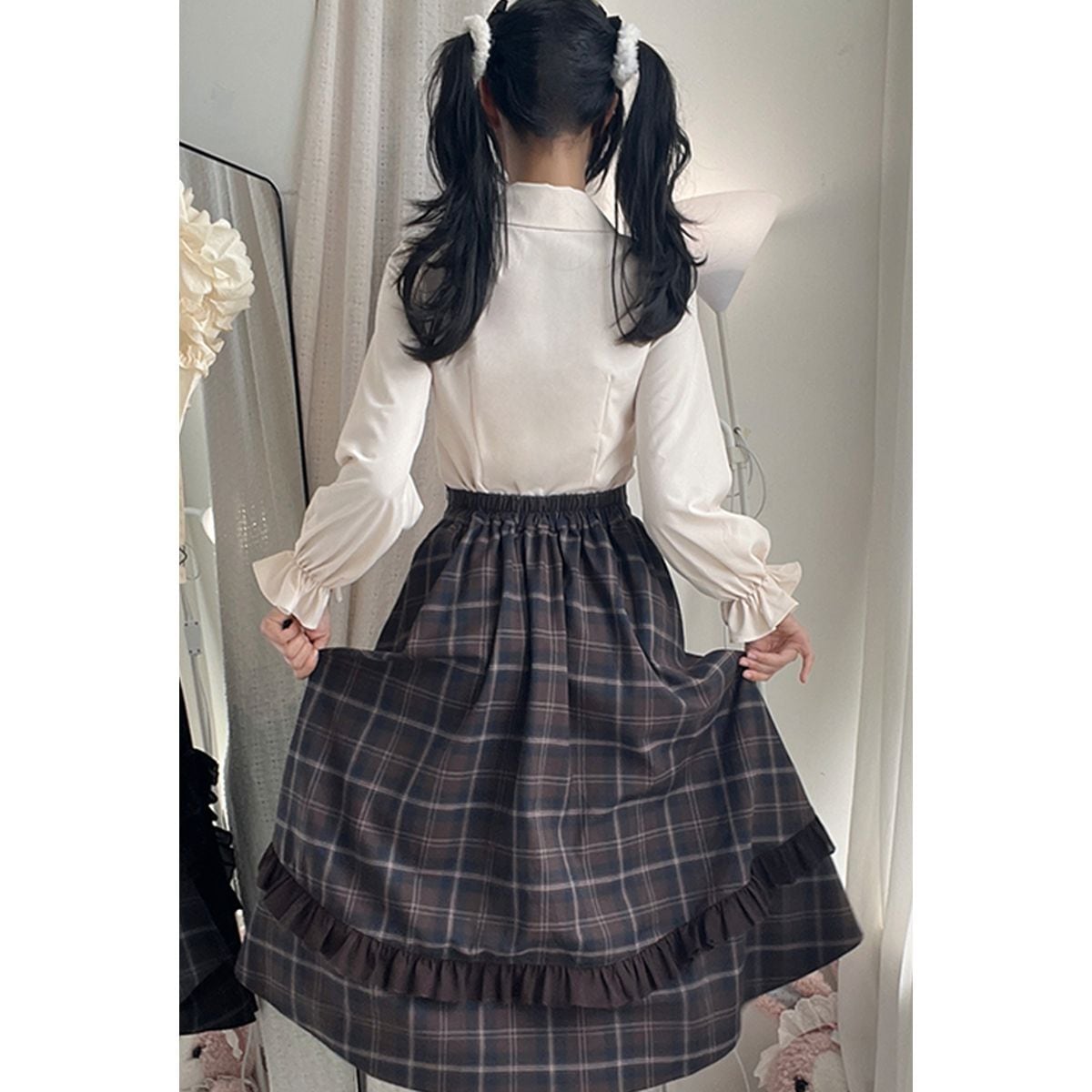 エレガントフリルショルダーチェックスカートセットアップ:トップス