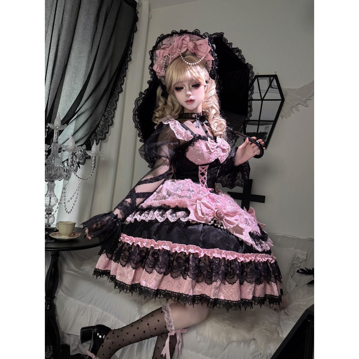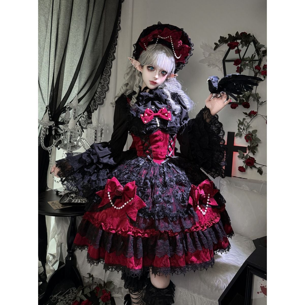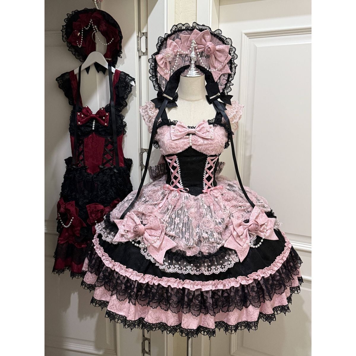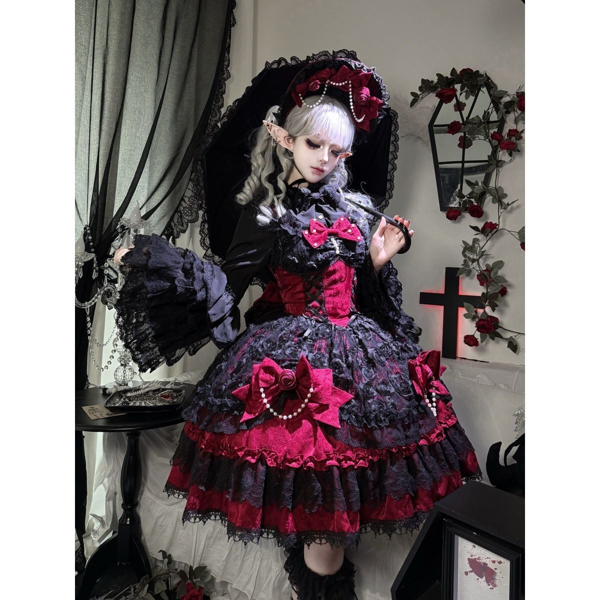 真夜中の戴冠式・薔薇リボンのゴシック&レースティアードドレス:JSK