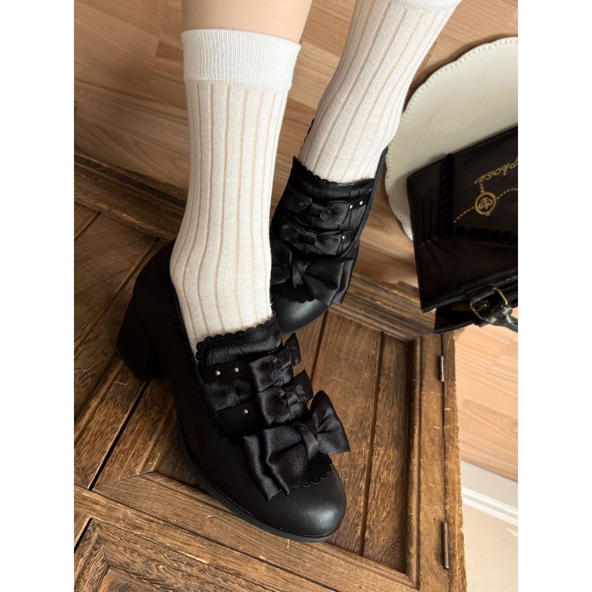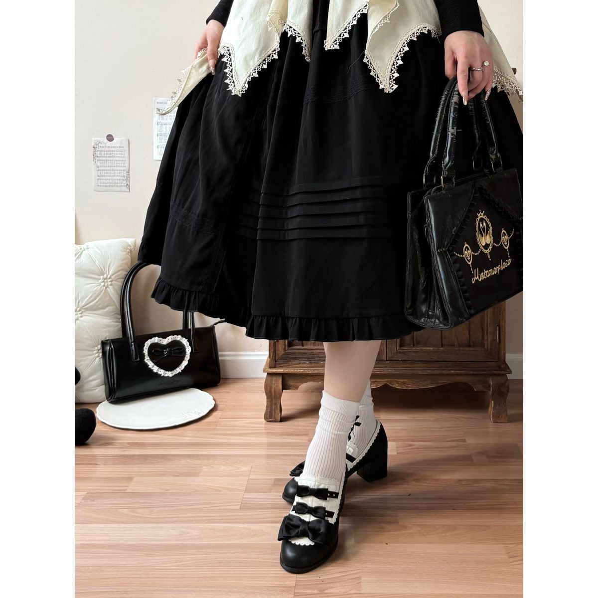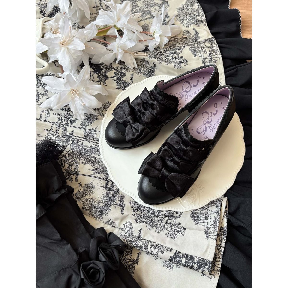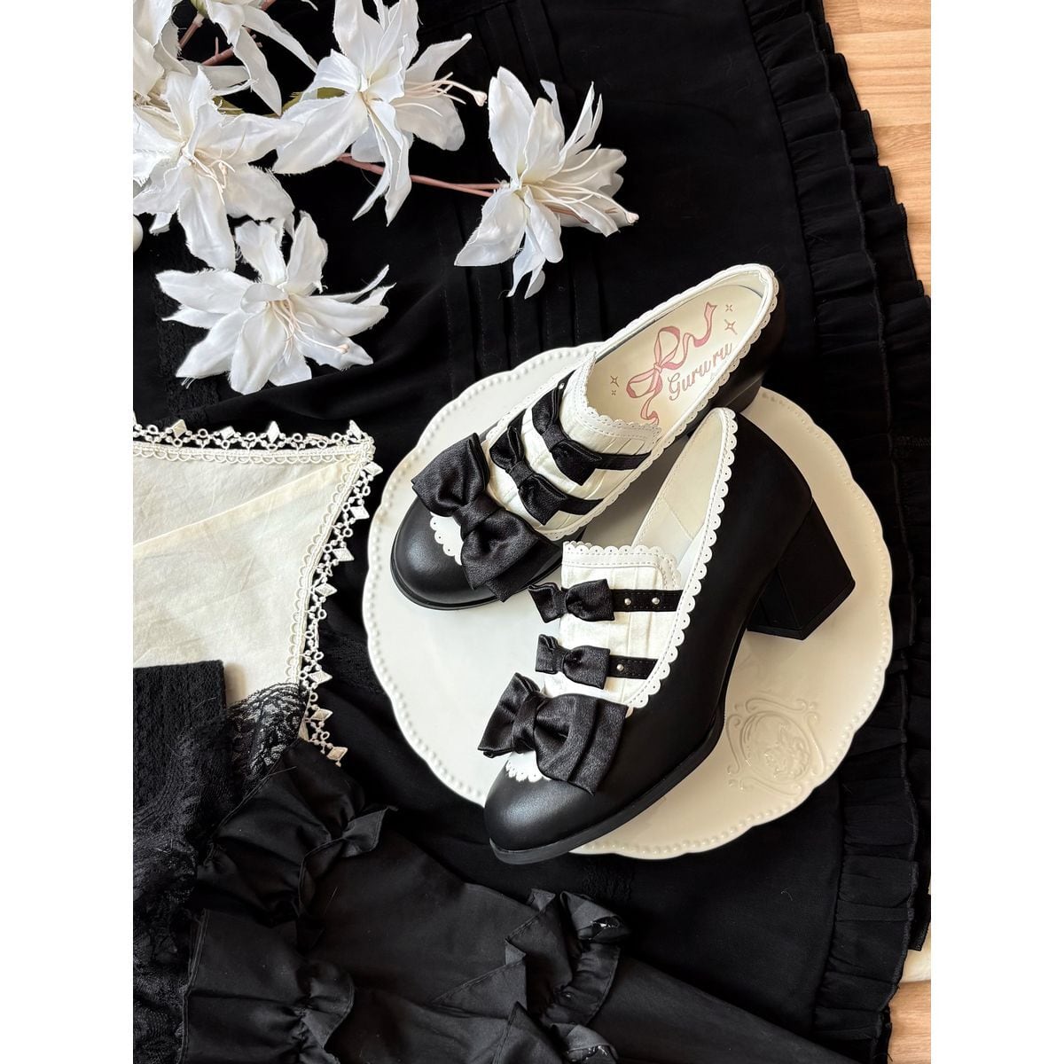 黒薔薇リボンフリルカバー付きゴシックヒールパンプス