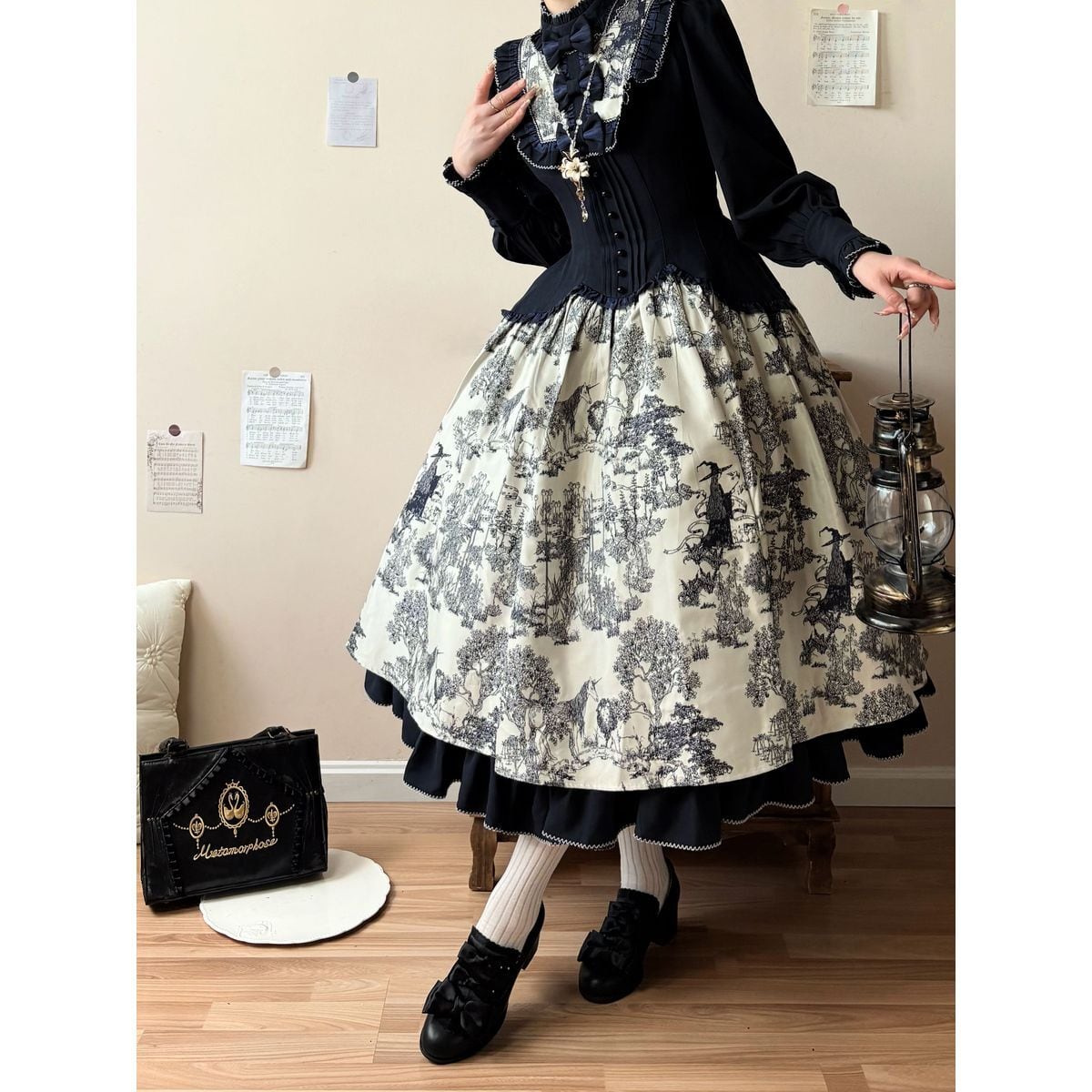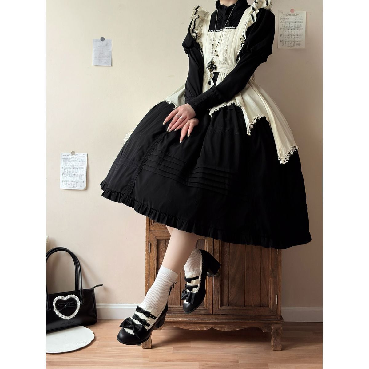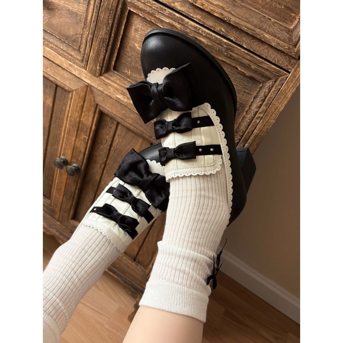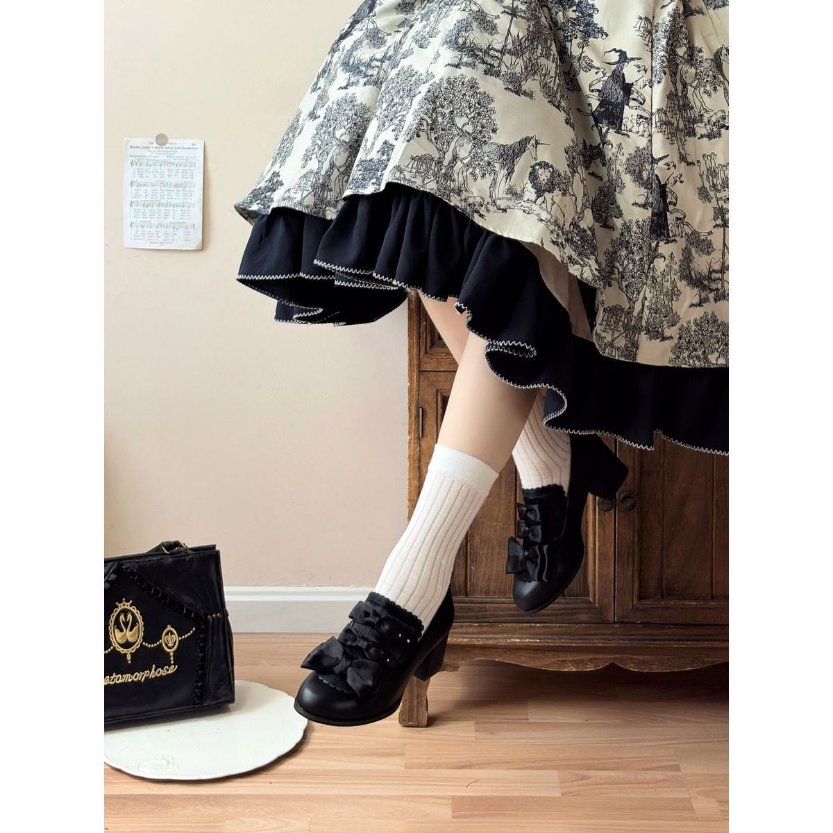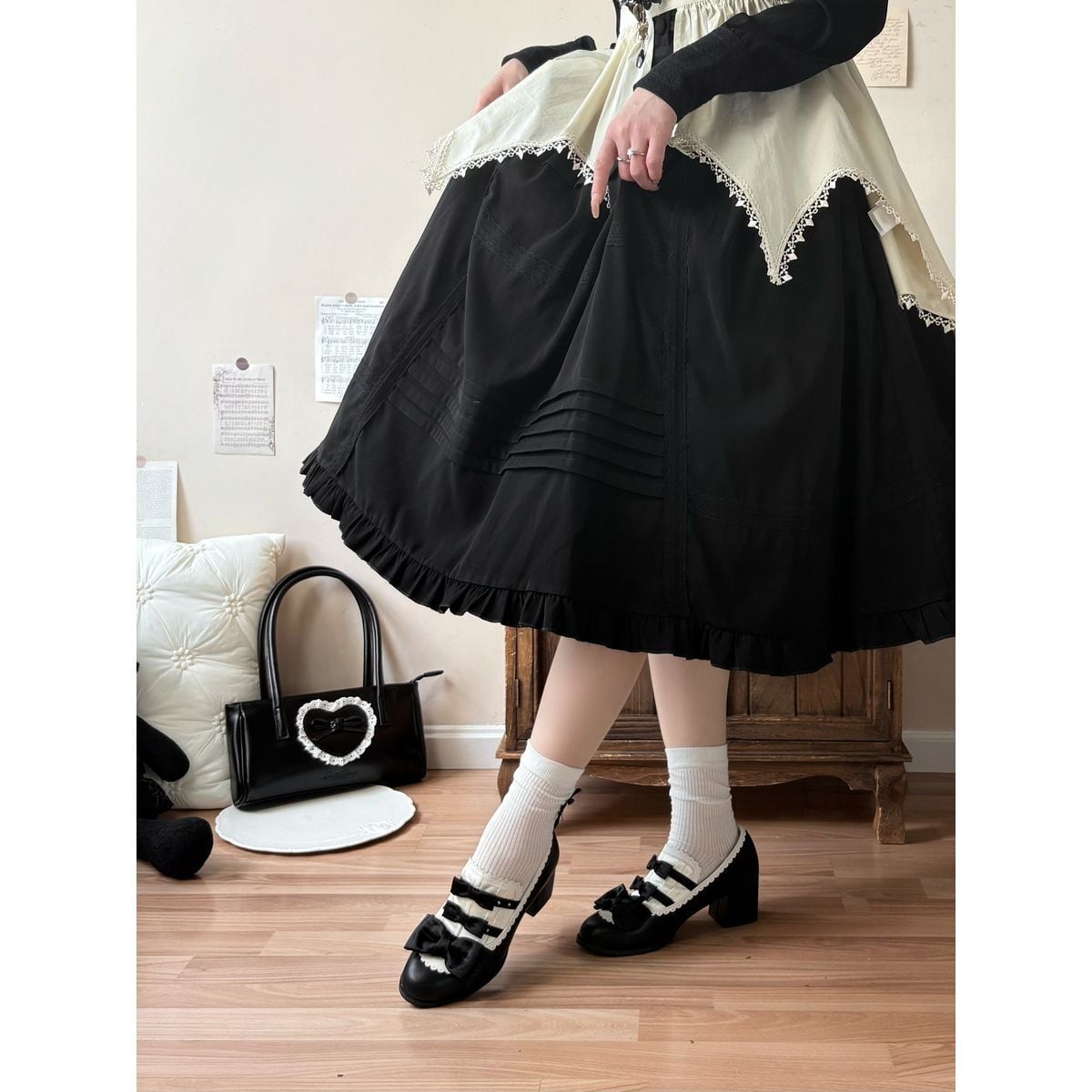 黒薔薇リボンフリルカバー付きゴシックヒールパンプス