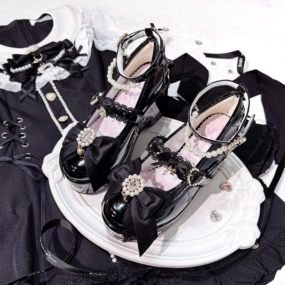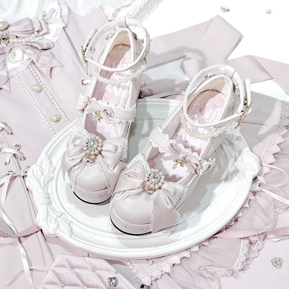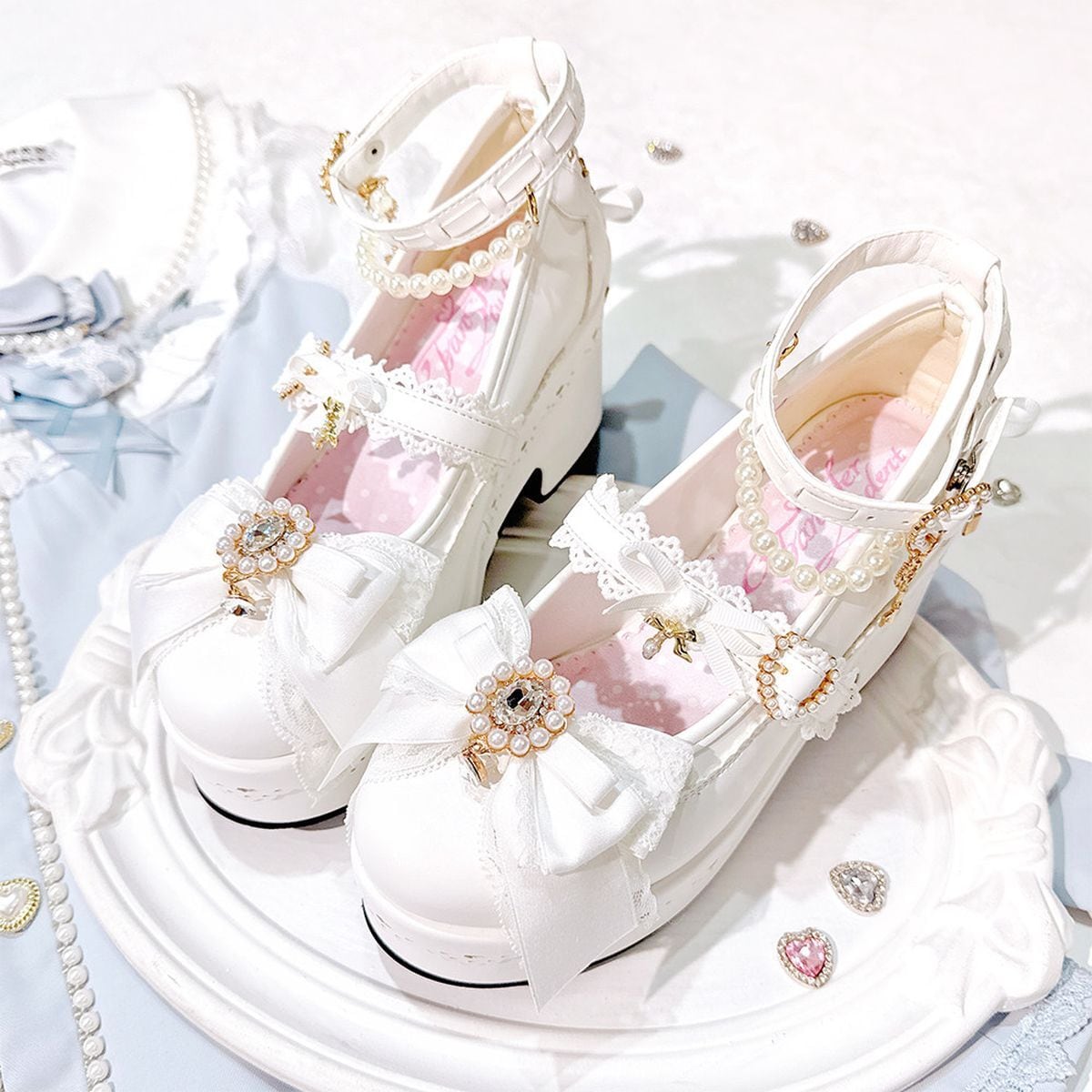 リボン&パールデコレースアップ厚底パンプス
