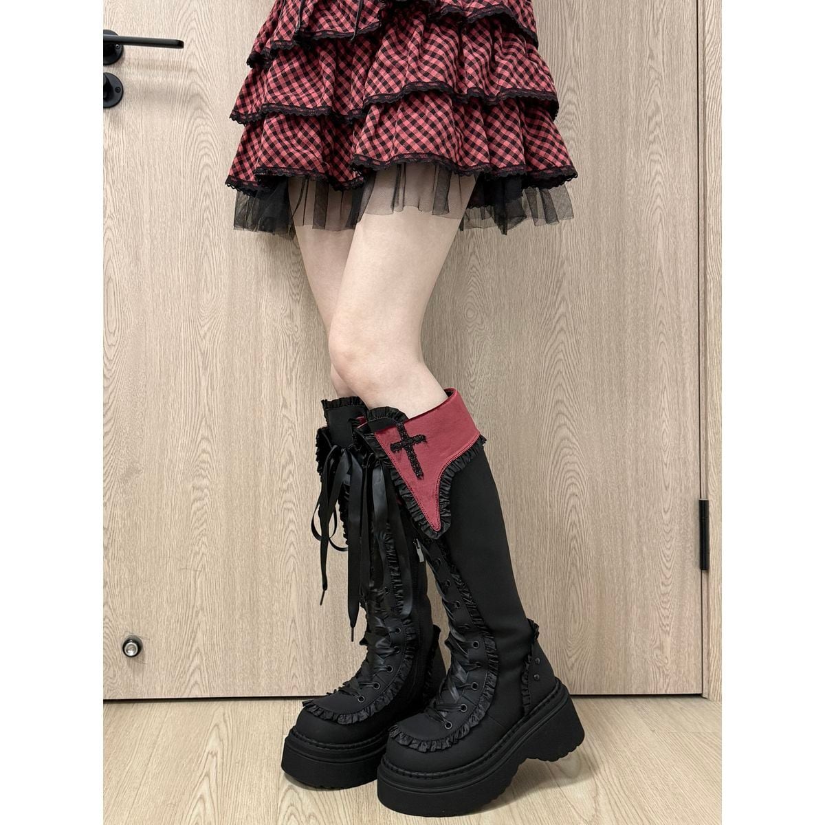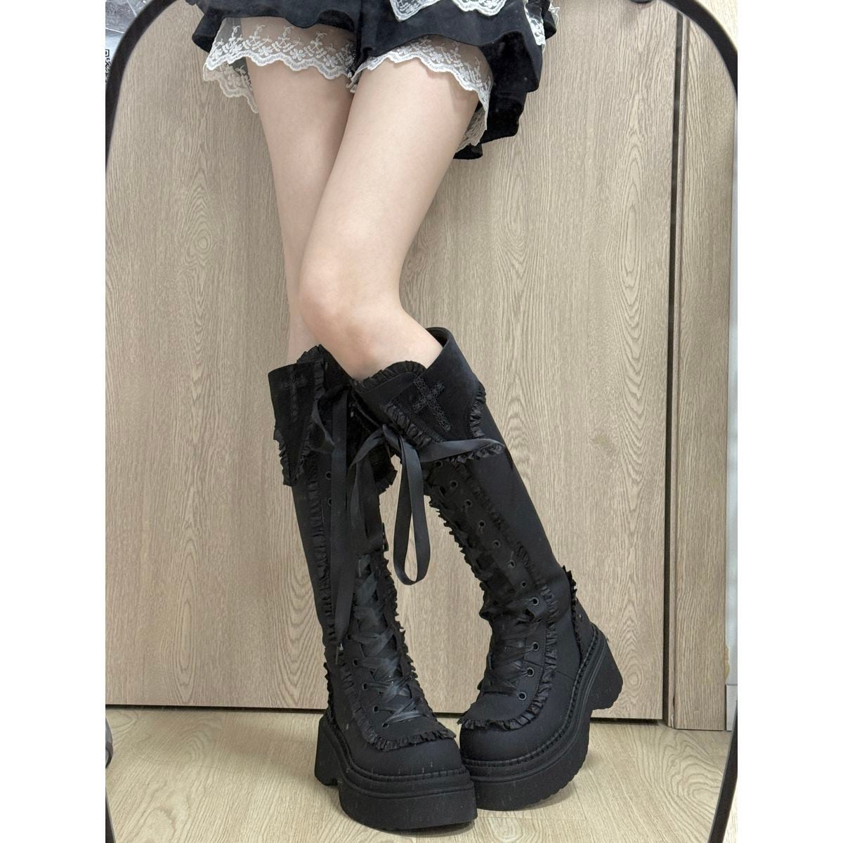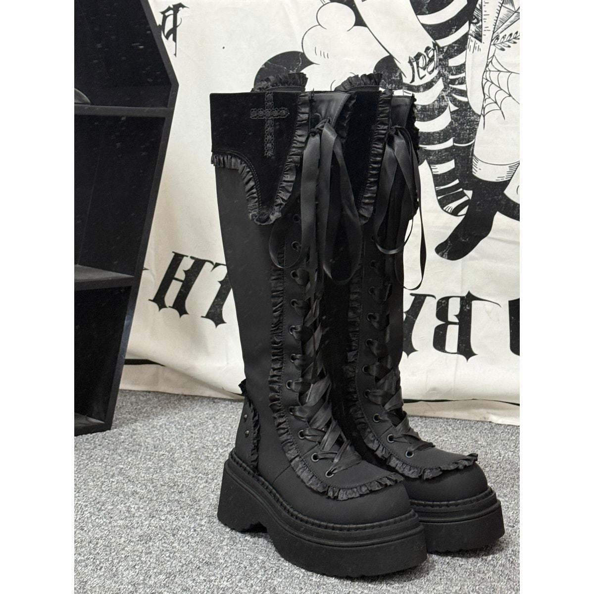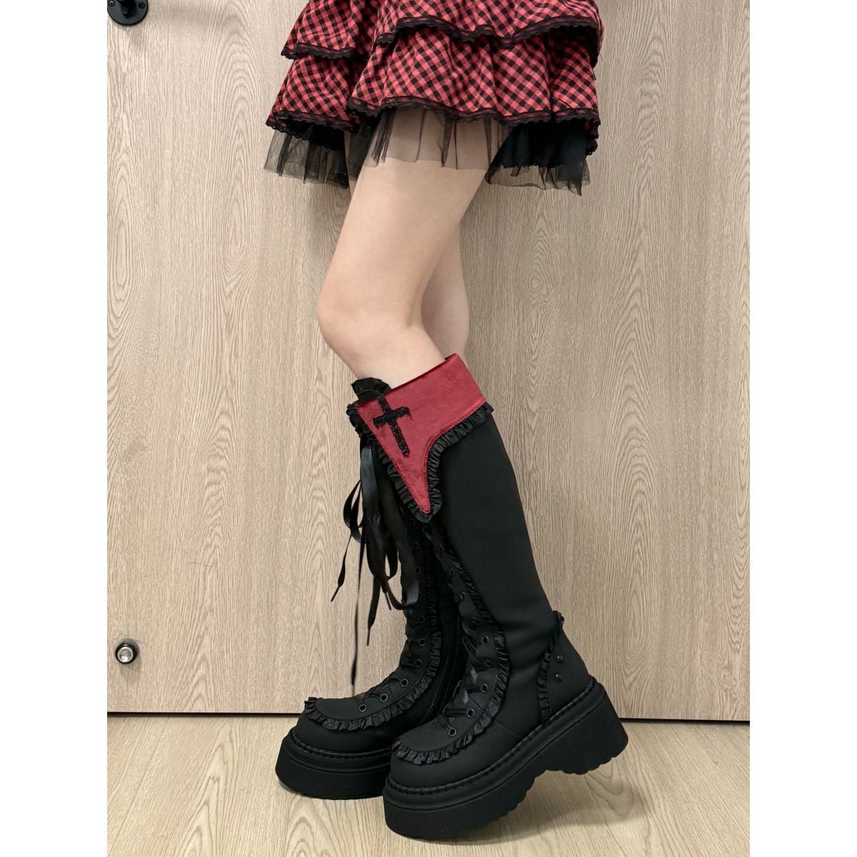 十字架刺繍とフリルエッジの厚底ロングブーツ