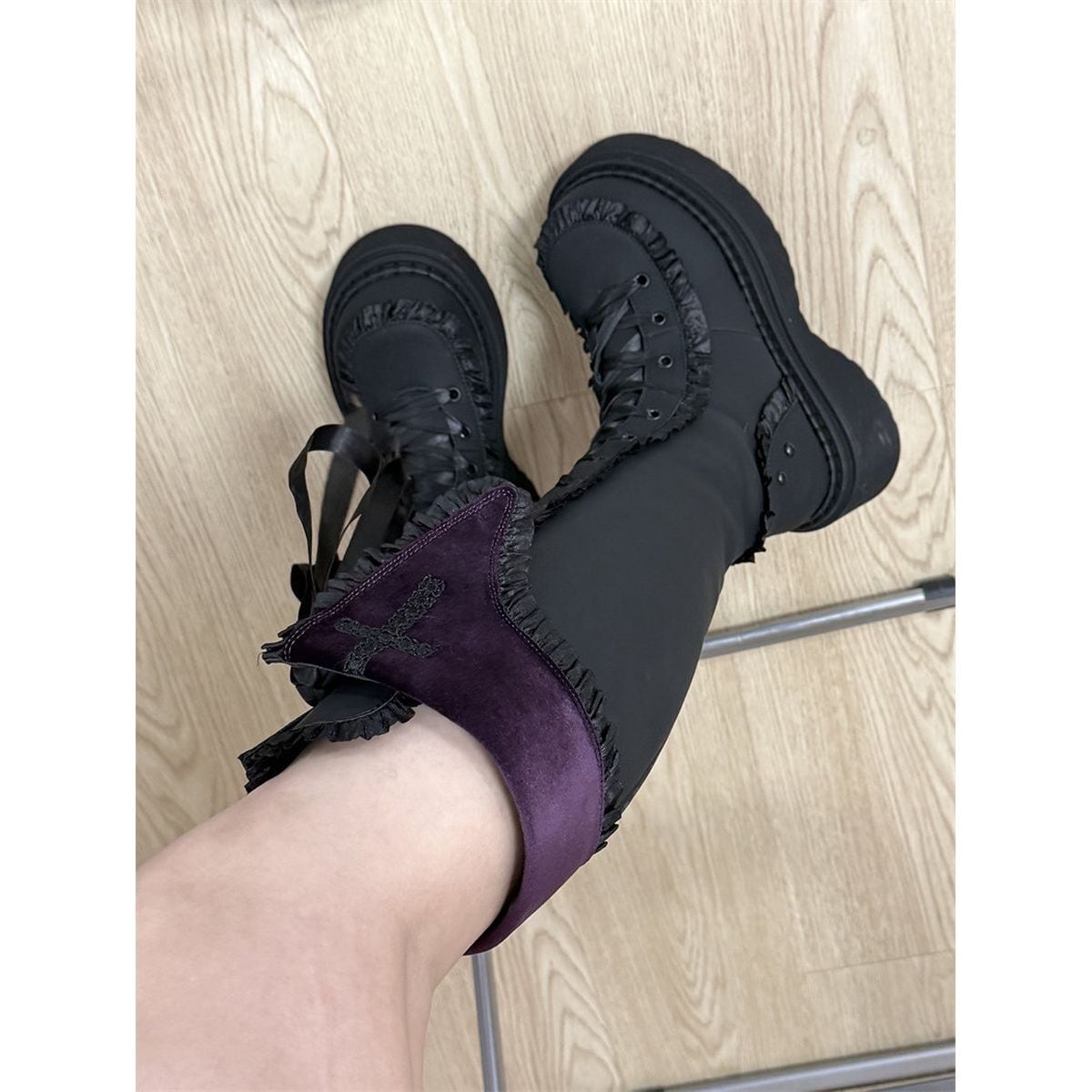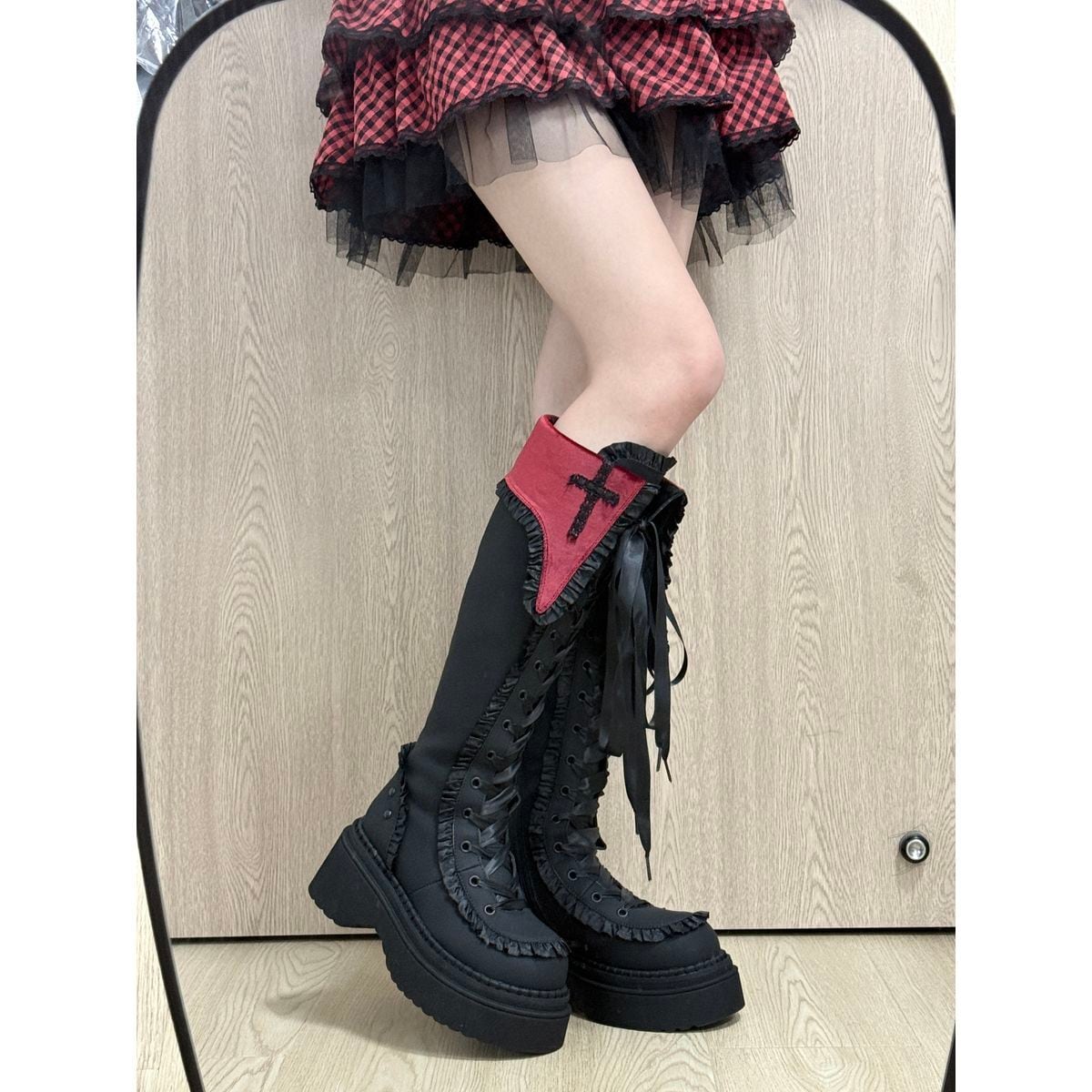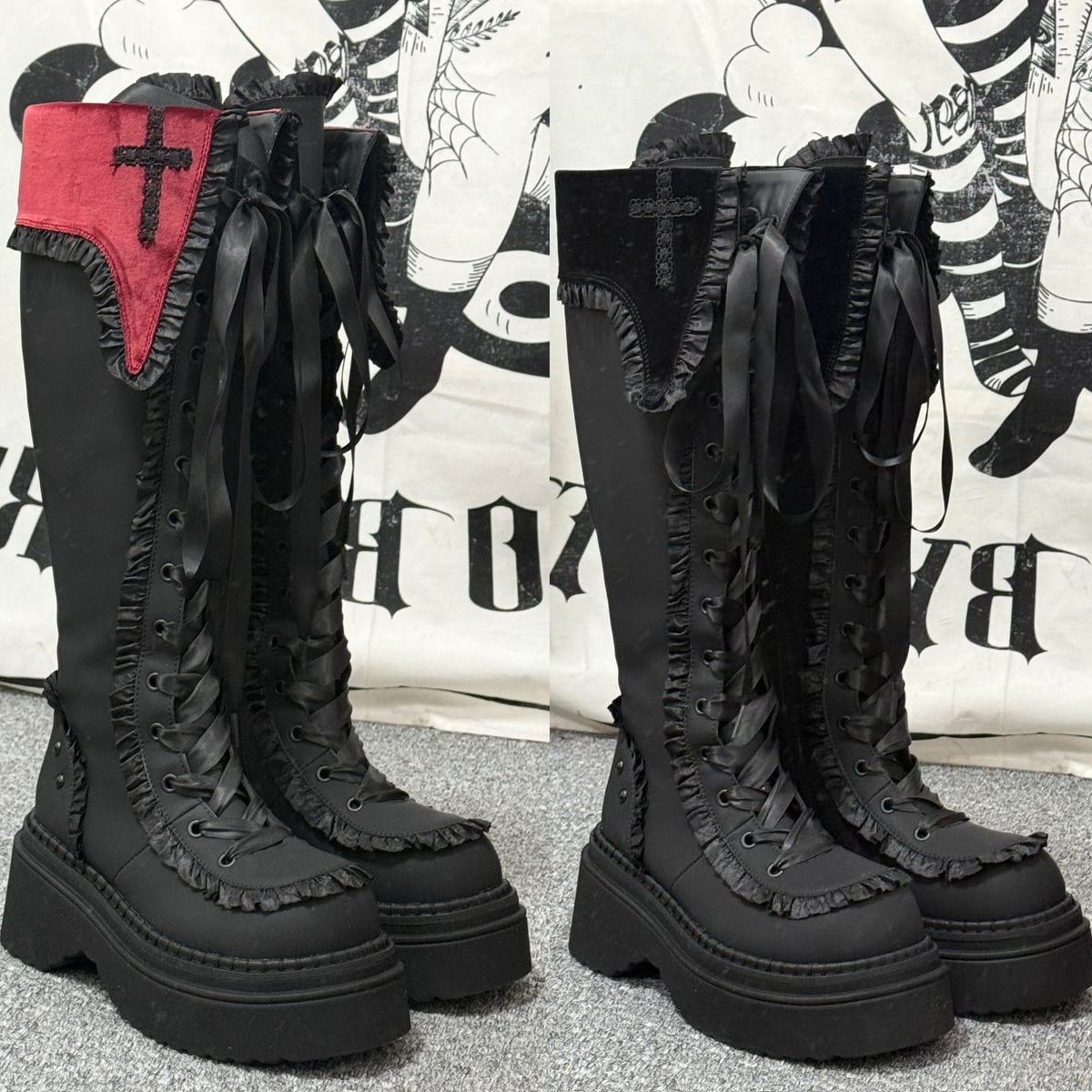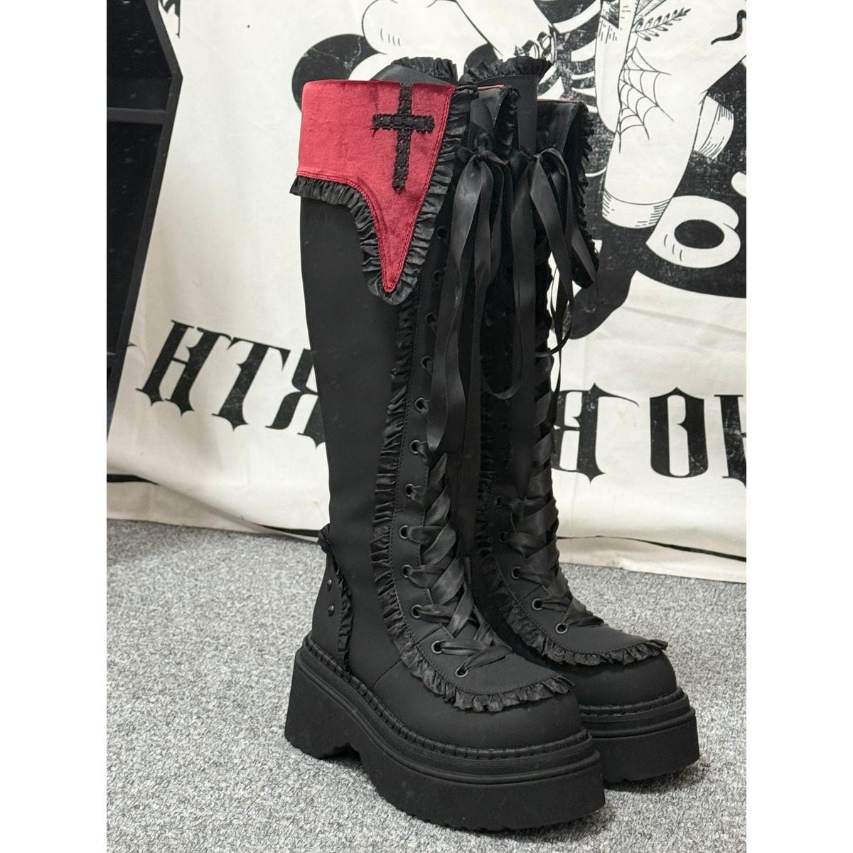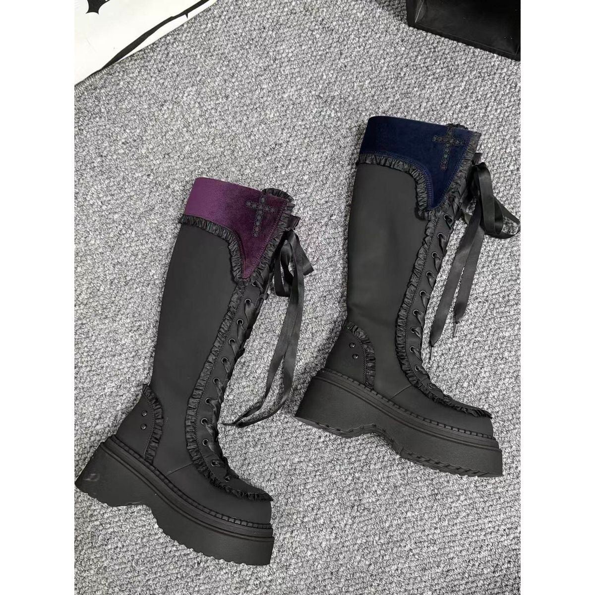 十字架刺繍とフリルエッジの厚底ロングブーツ