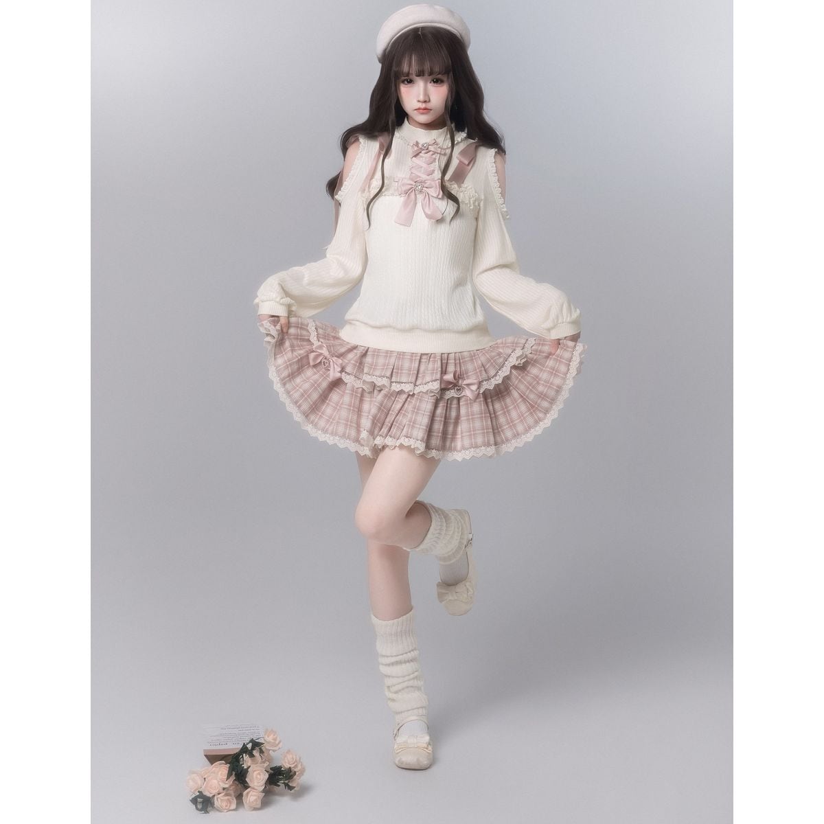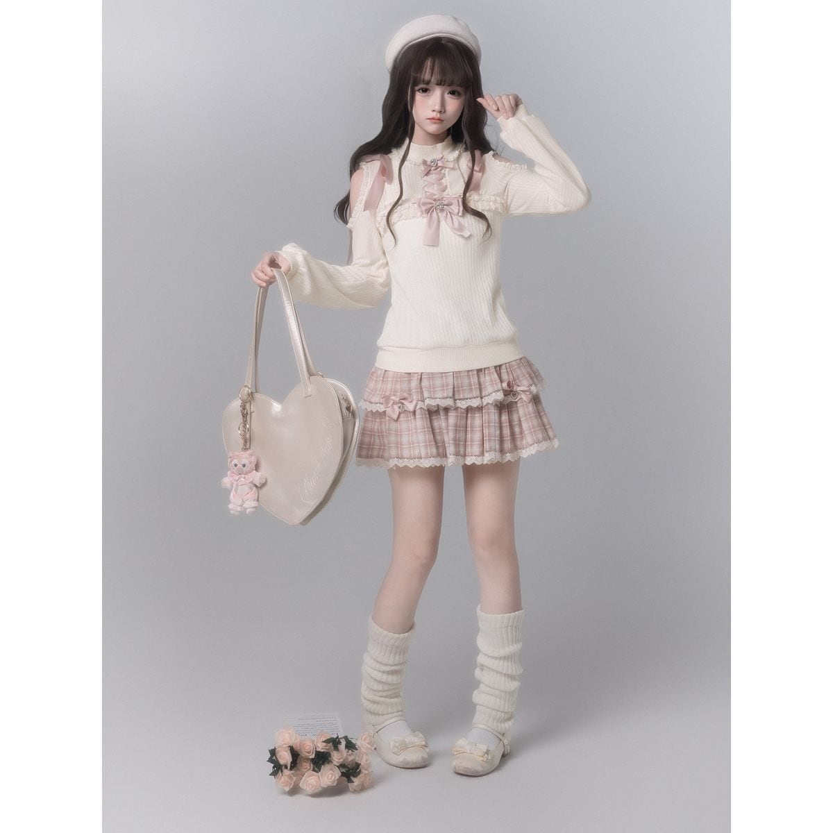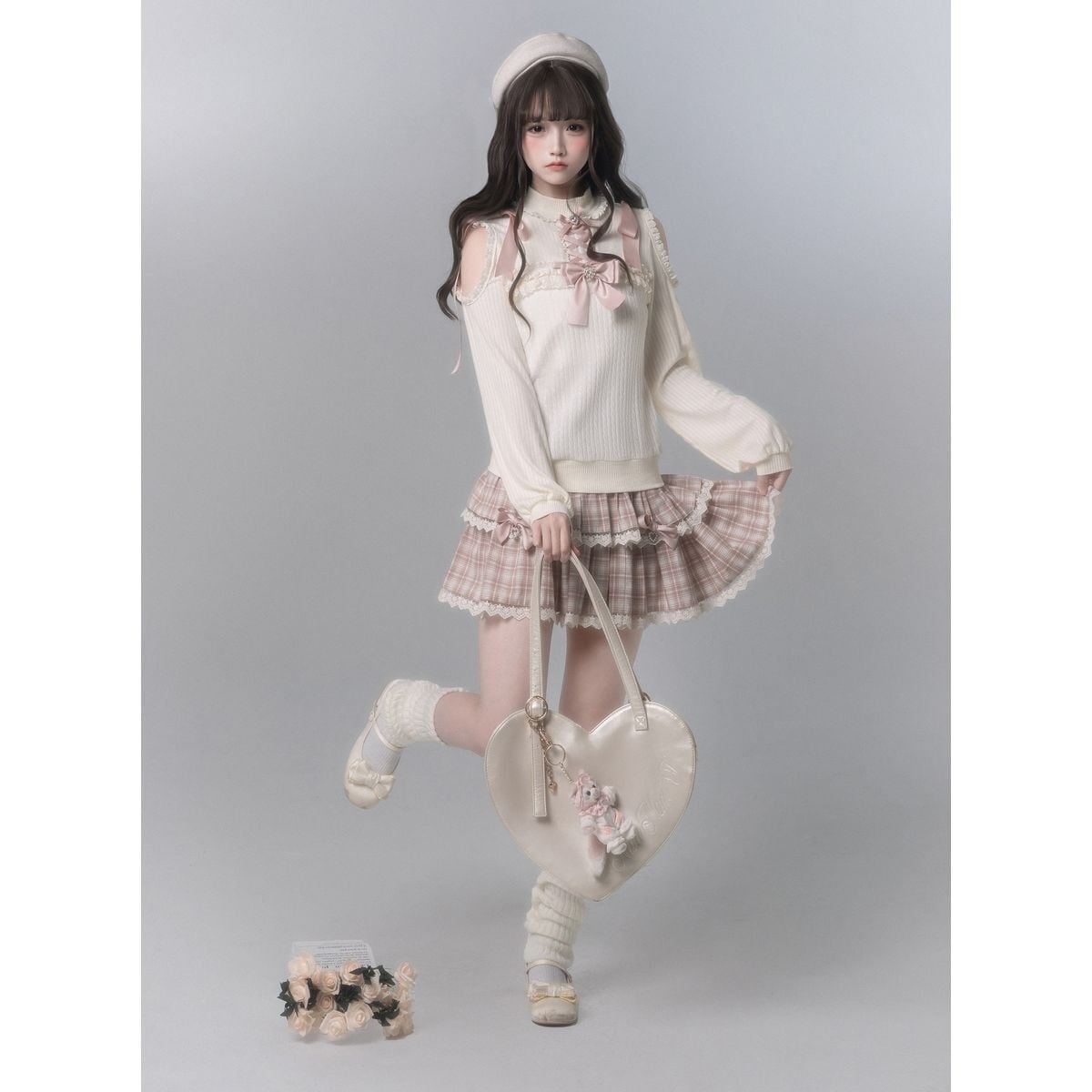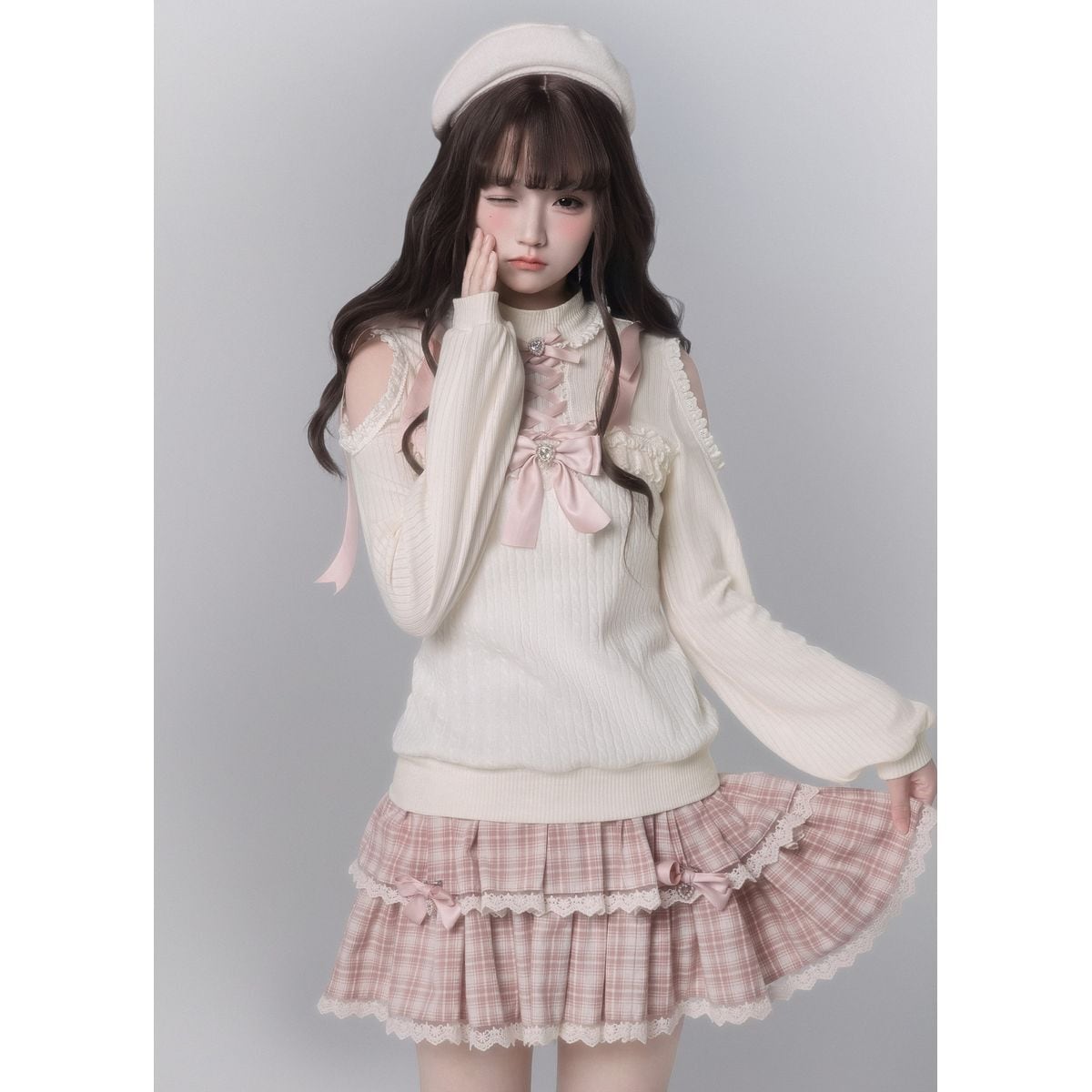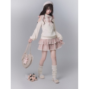 編み上げリボンニットさくらチェックのティアードフリルセット:スカート