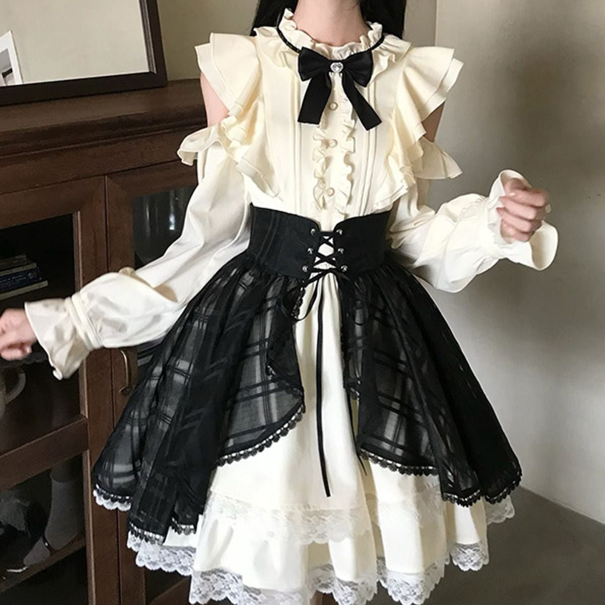 オープンショルダーシアーチェックセットアップ:トップス