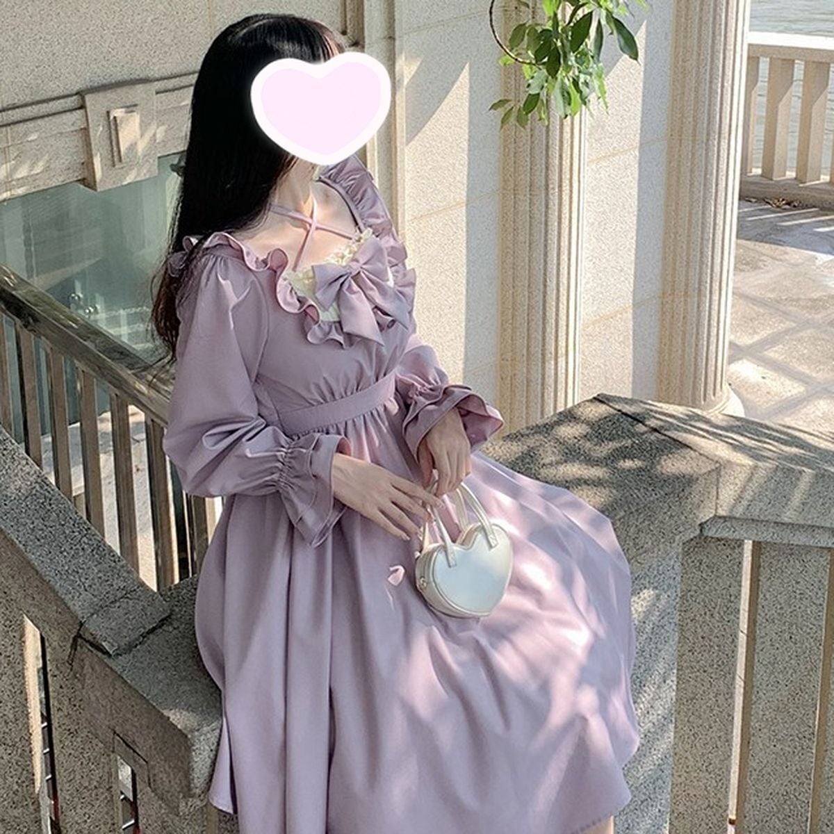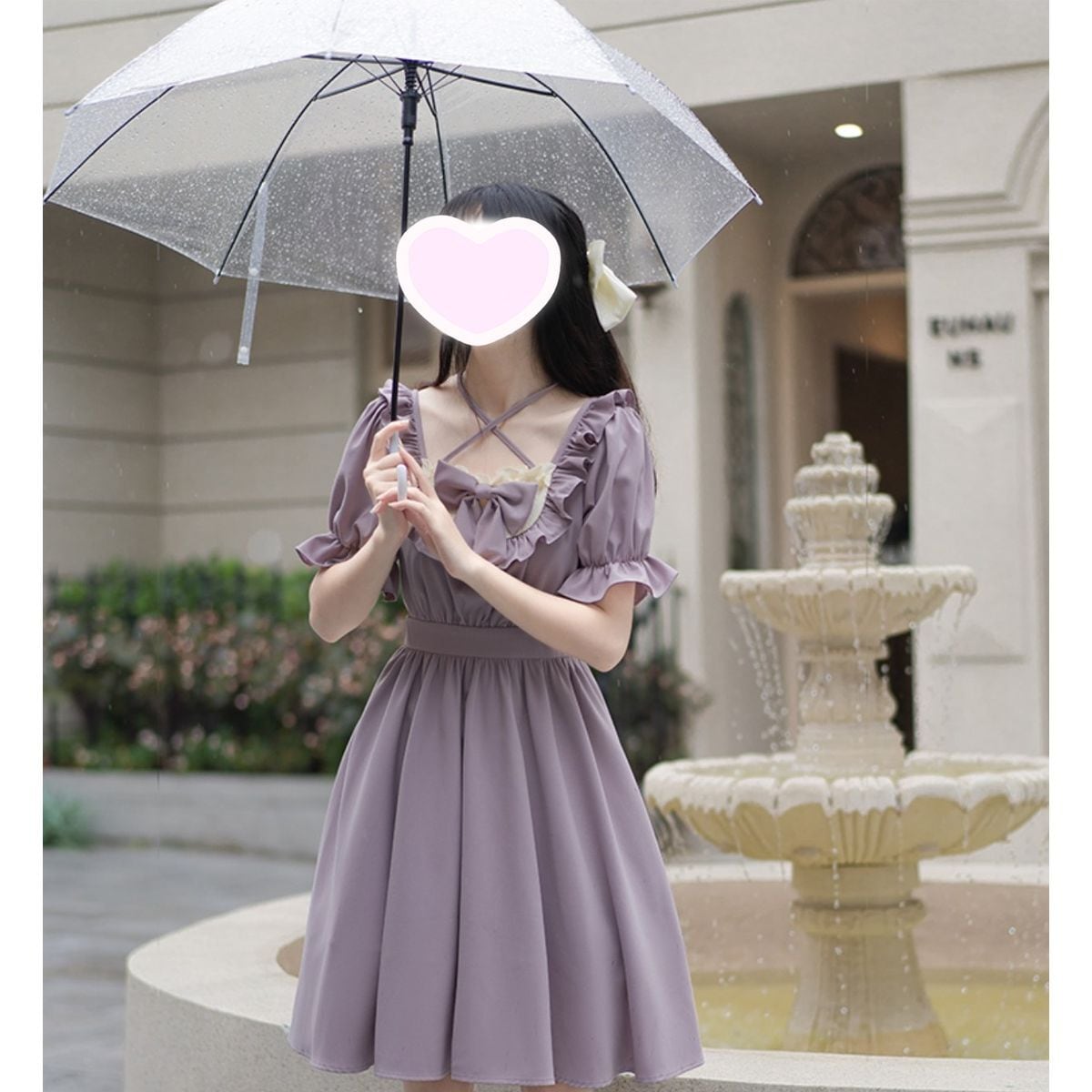 フリル襟キャンディースリーブパープル半袖ワンピース