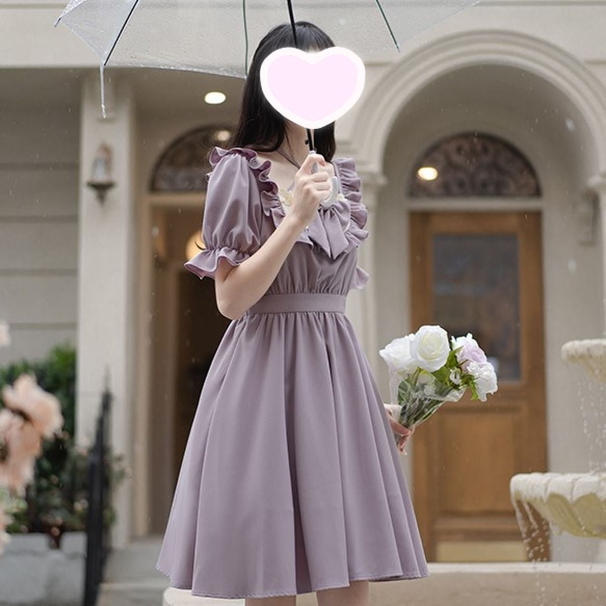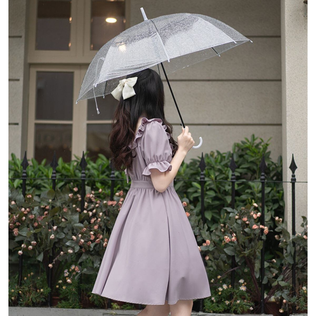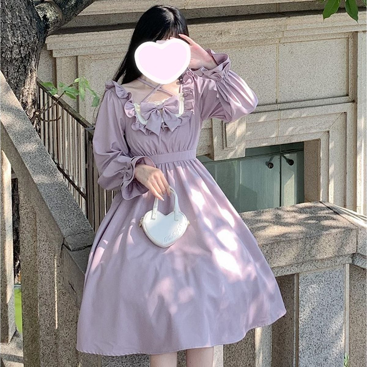 フリル襟キャンディースリーブパープル長袖ワンピース