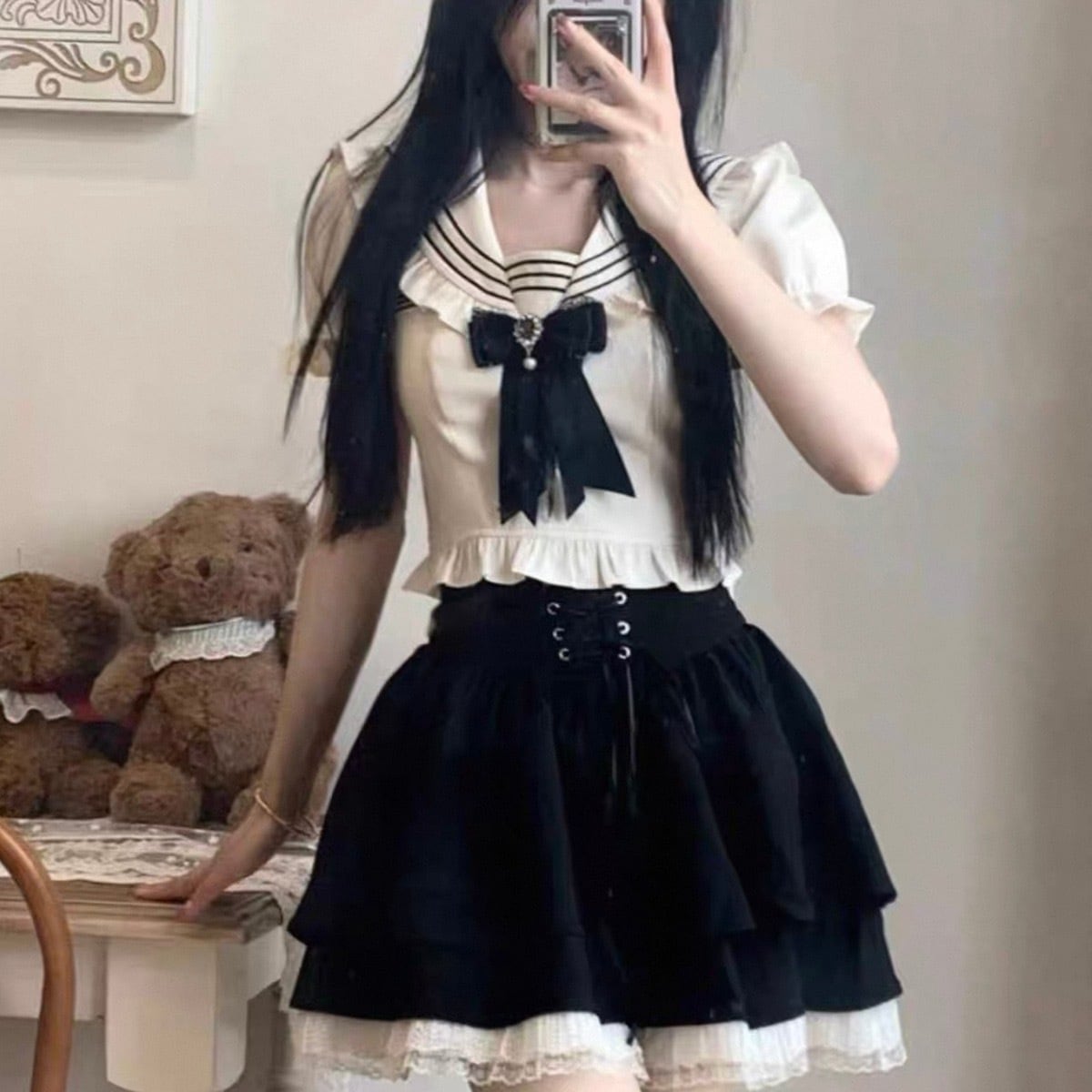 セーラー襟トップス+レースアップスカートセットアップ